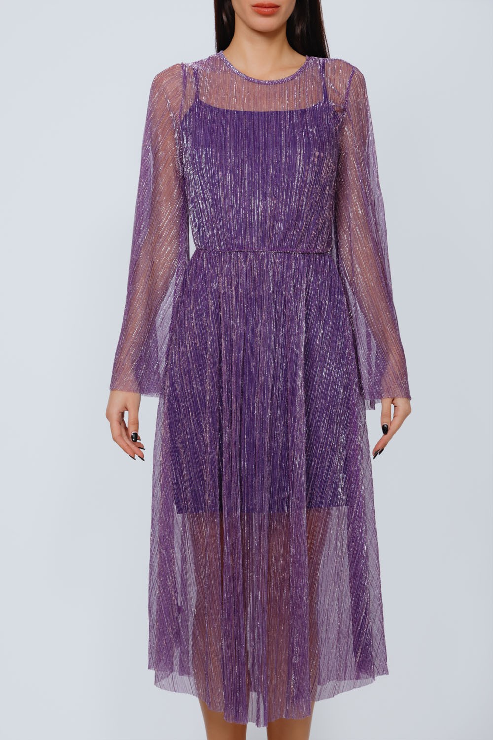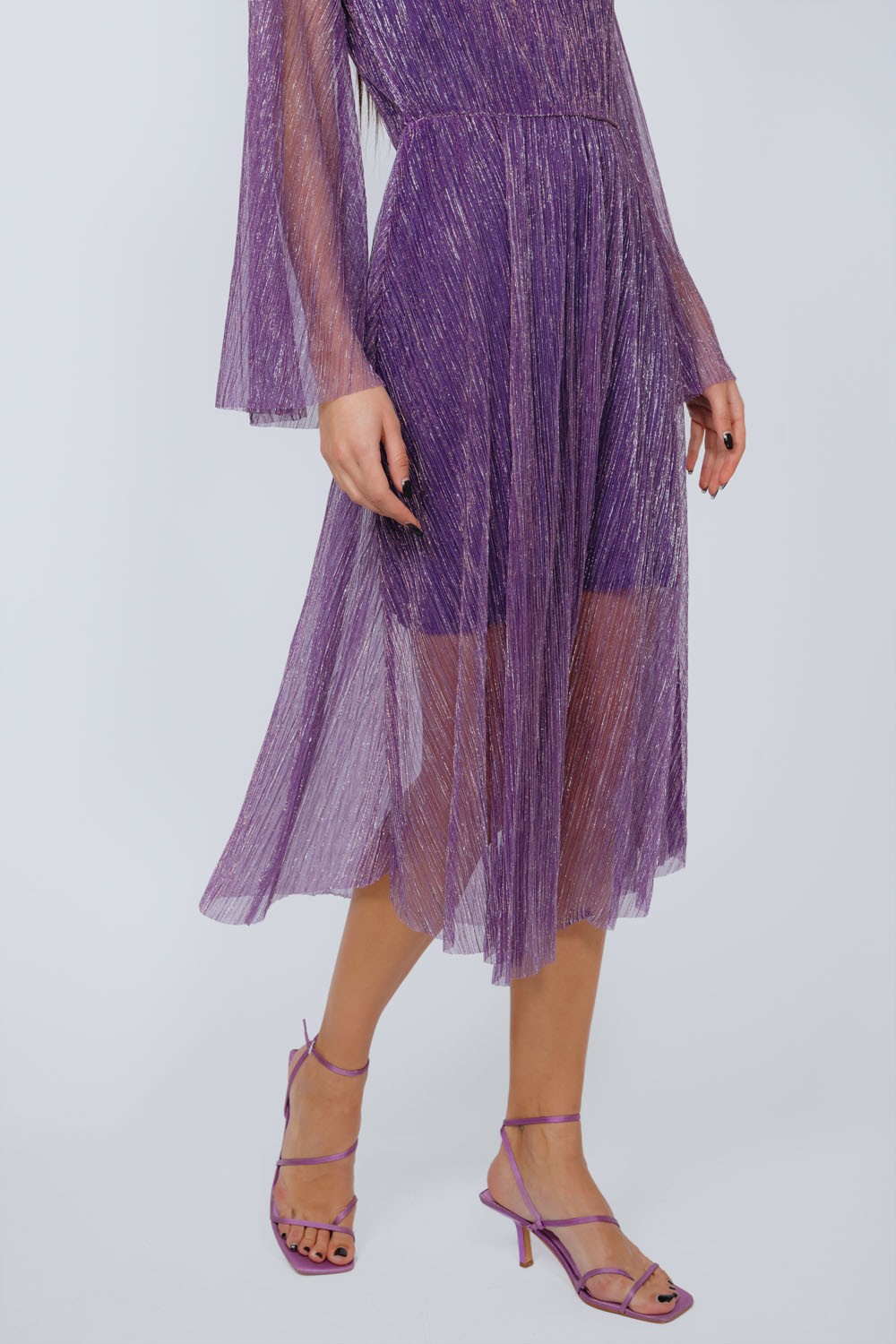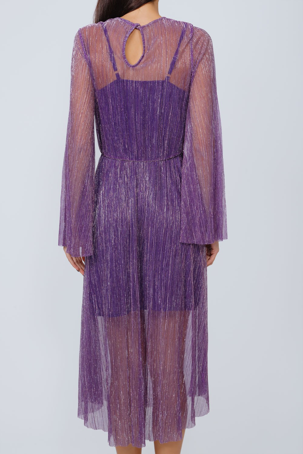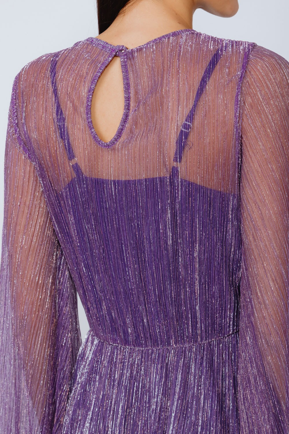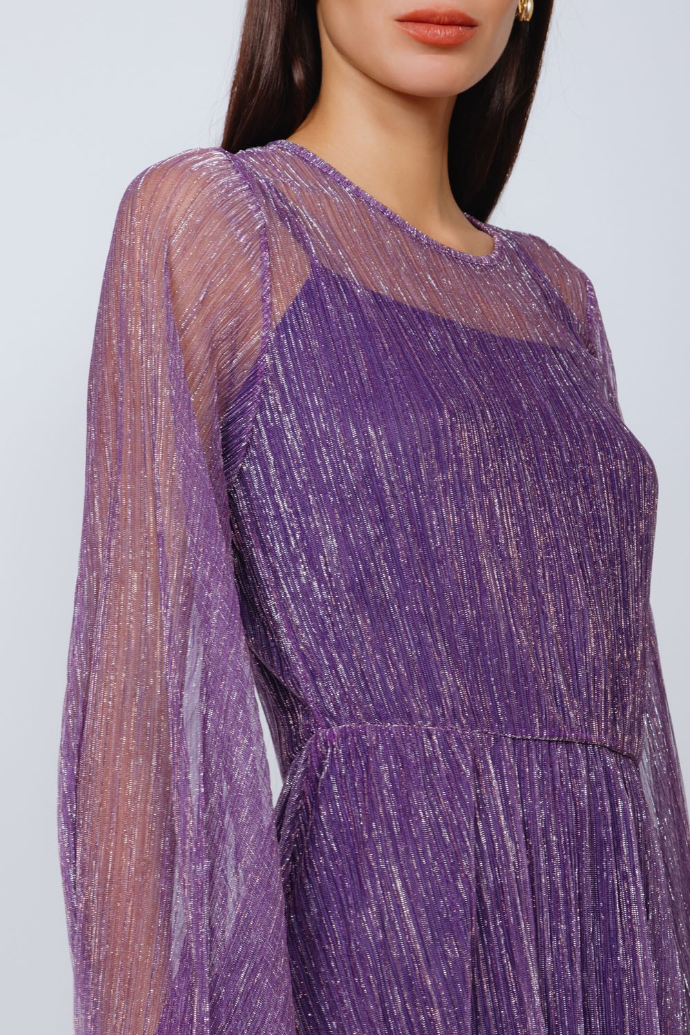 Haljina cvjetnog uzorka sa lurex sjajnim nitima. Dugog rukava sa elastičnim rubom. Kopčanje straga na gumb i bočnim, sakrivenim patent zatvaračem. Asimetričan donji dio. Pojas u struku od is..