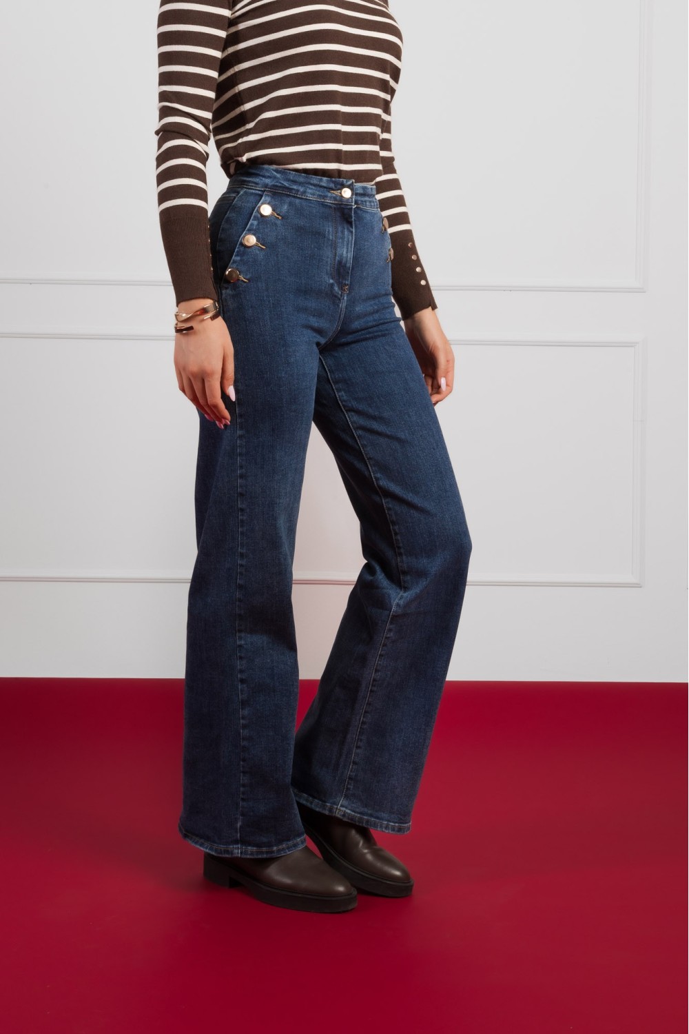 Plave traper hlače visokog struka s dekorativnim gumbima s obje strane – moderan i chic izbor za svaki dan. Elegantni detalji čine ih posebnom verzijom klasičnih traperica, dok rastezljivi m..