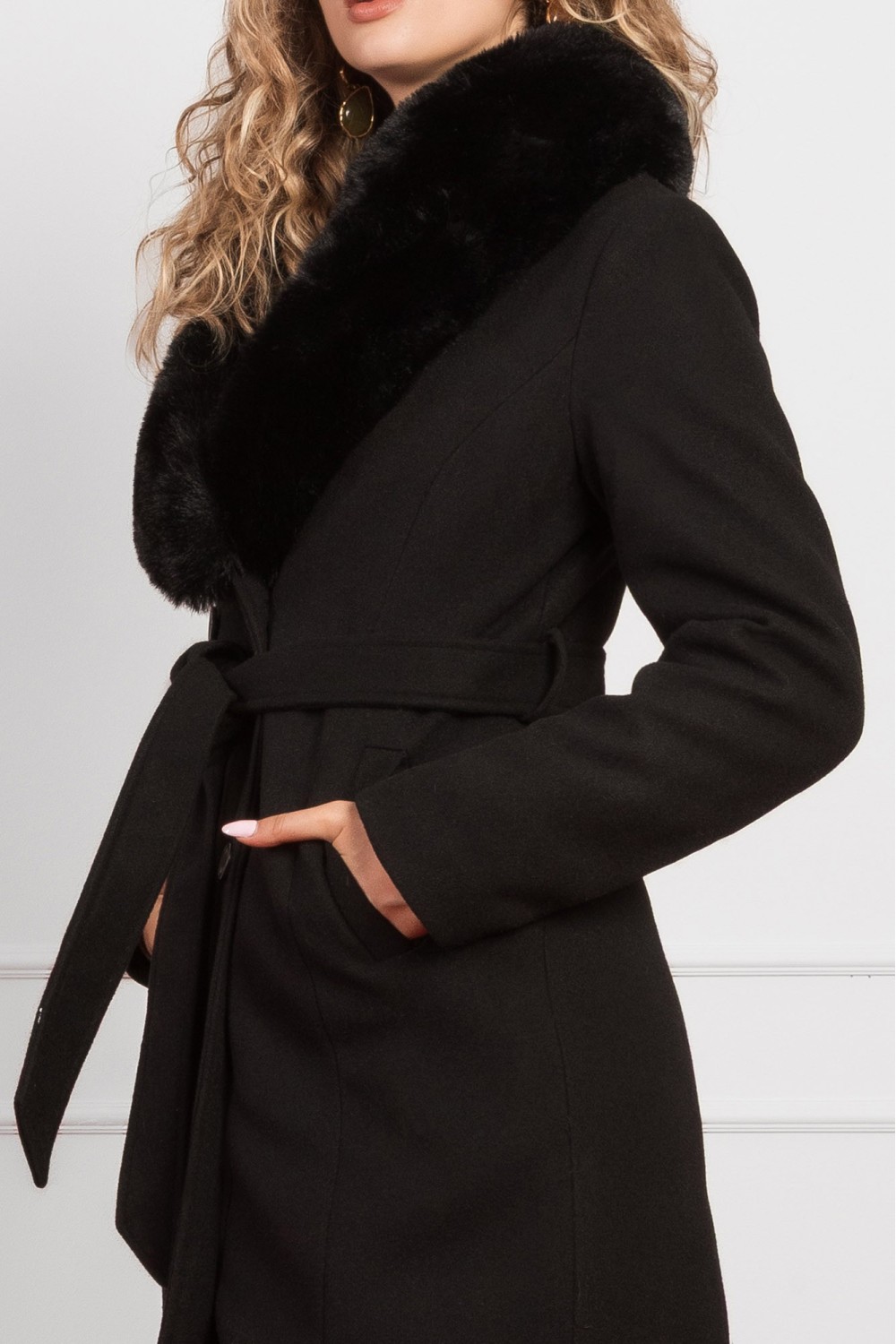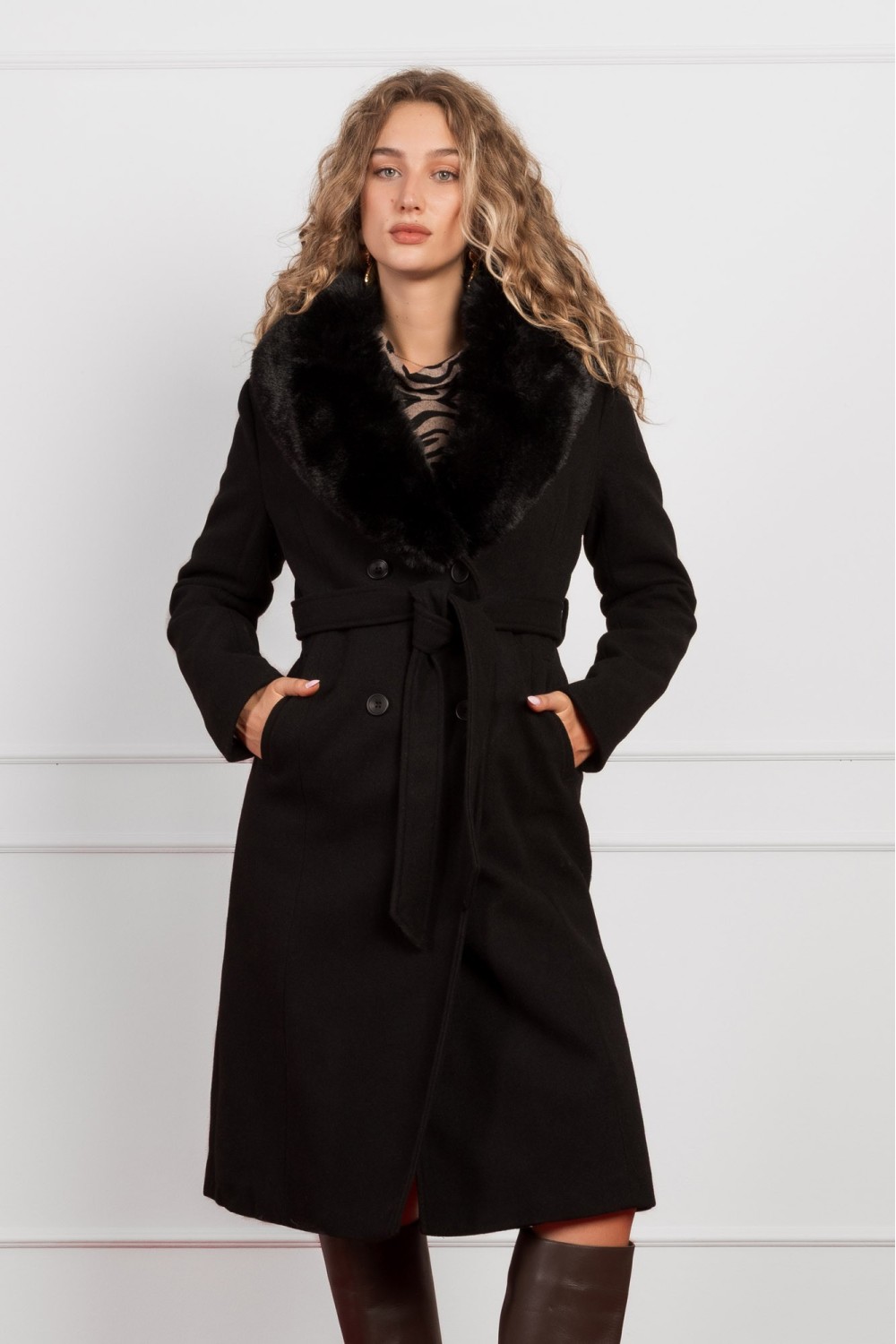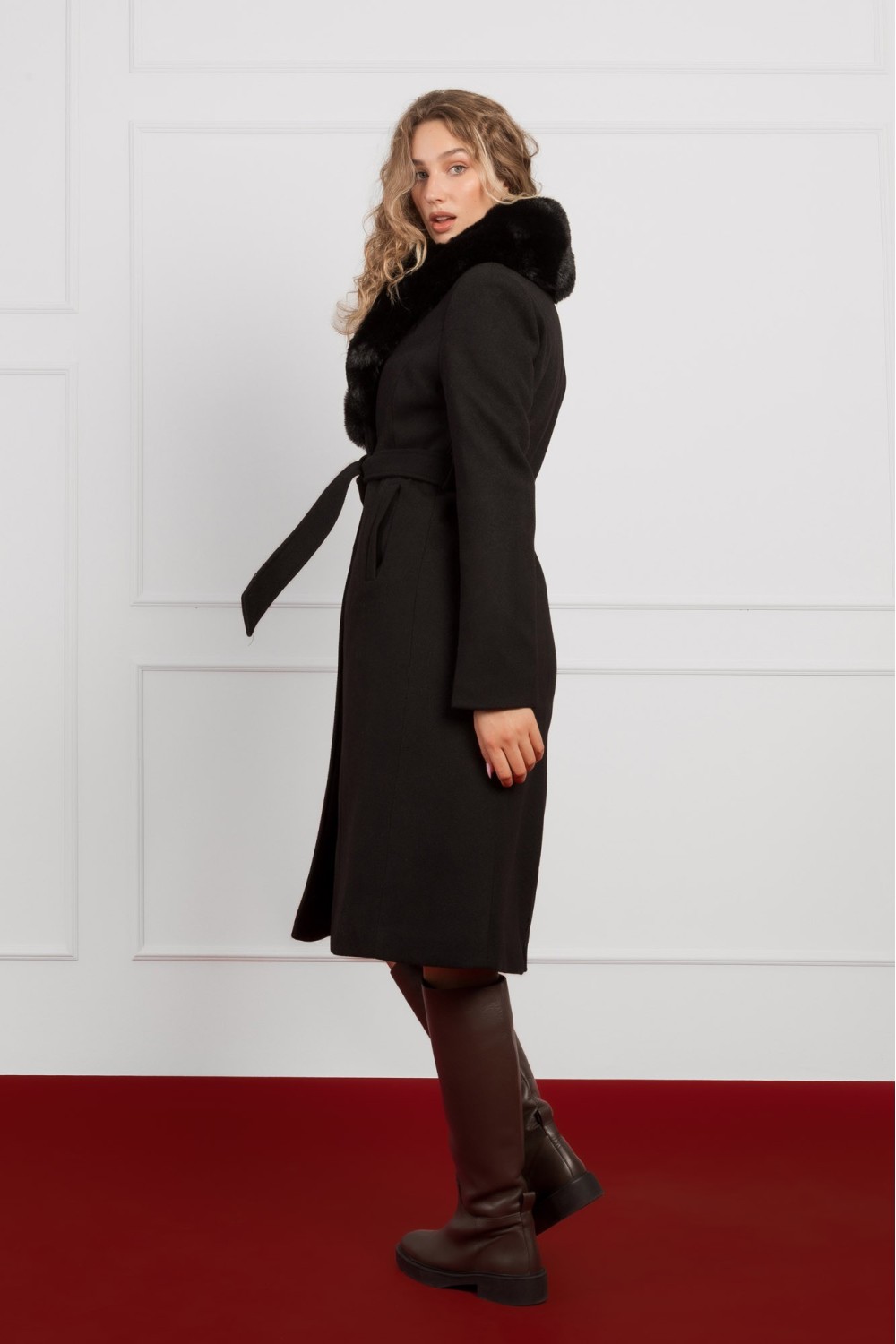 Duga zimska punjena jakna, s kapuljačom i krznom. Kopčanje sprijeda patent zatvaračem i preklopnikom s gumbima na pritisak. U struku remenom s kopčom. Sprijeda džepovi. Povišeni ovratnik s d..