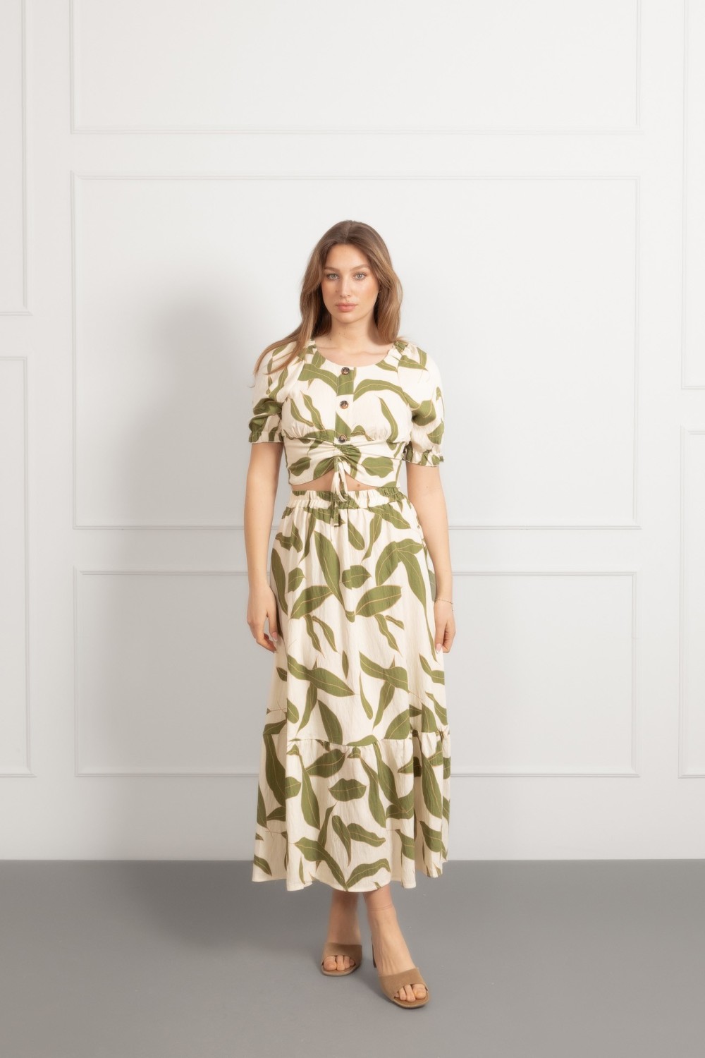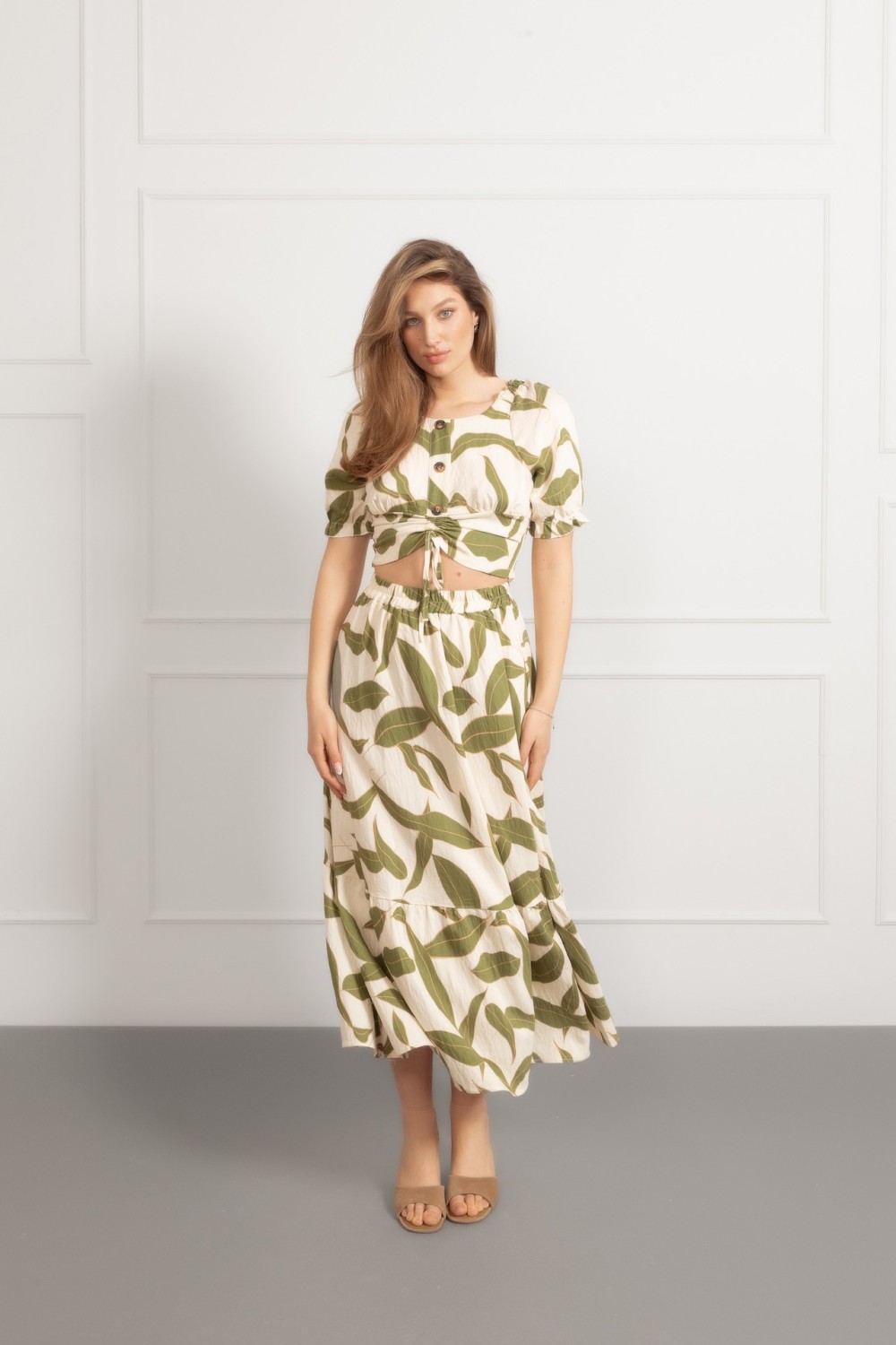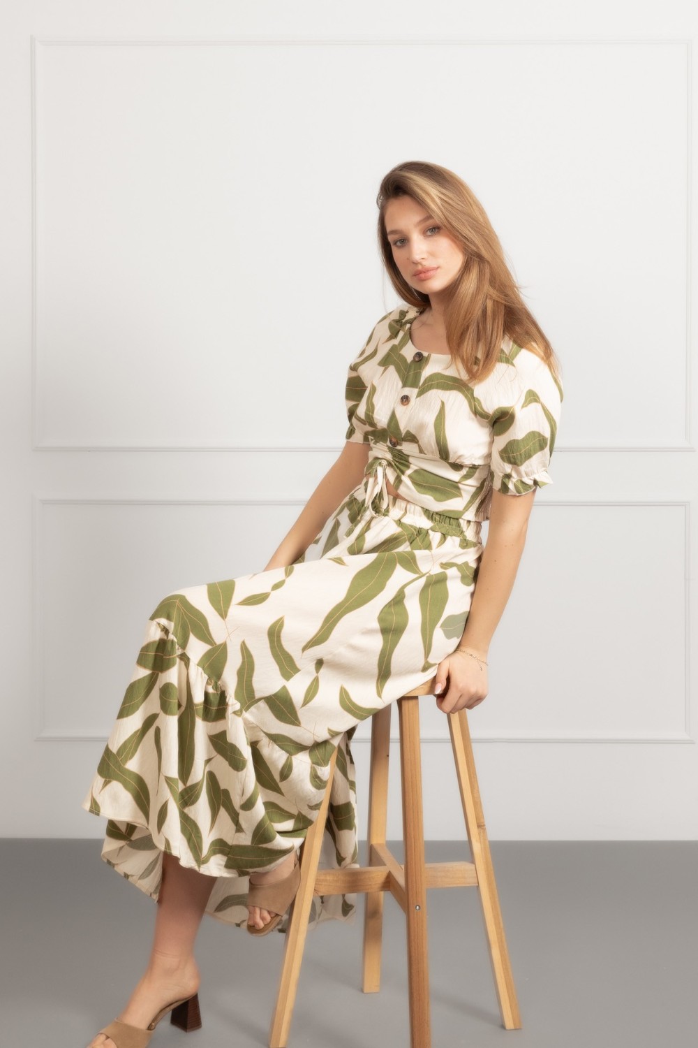 Elegantni dvodijelni komplet u bež nijansi izrađen od lagane mješavine pamuka i lana. Gornji dio bez rukava s ovratnikom, dekorativnim gumbima i vezanjem u struku lijepo naglašava siluetu, d..