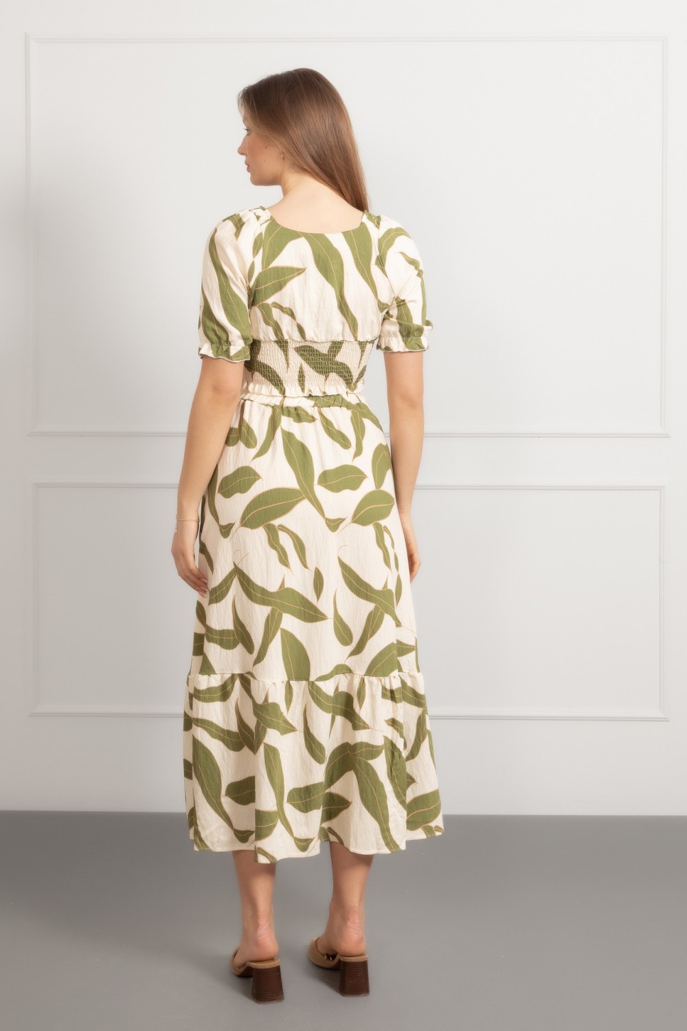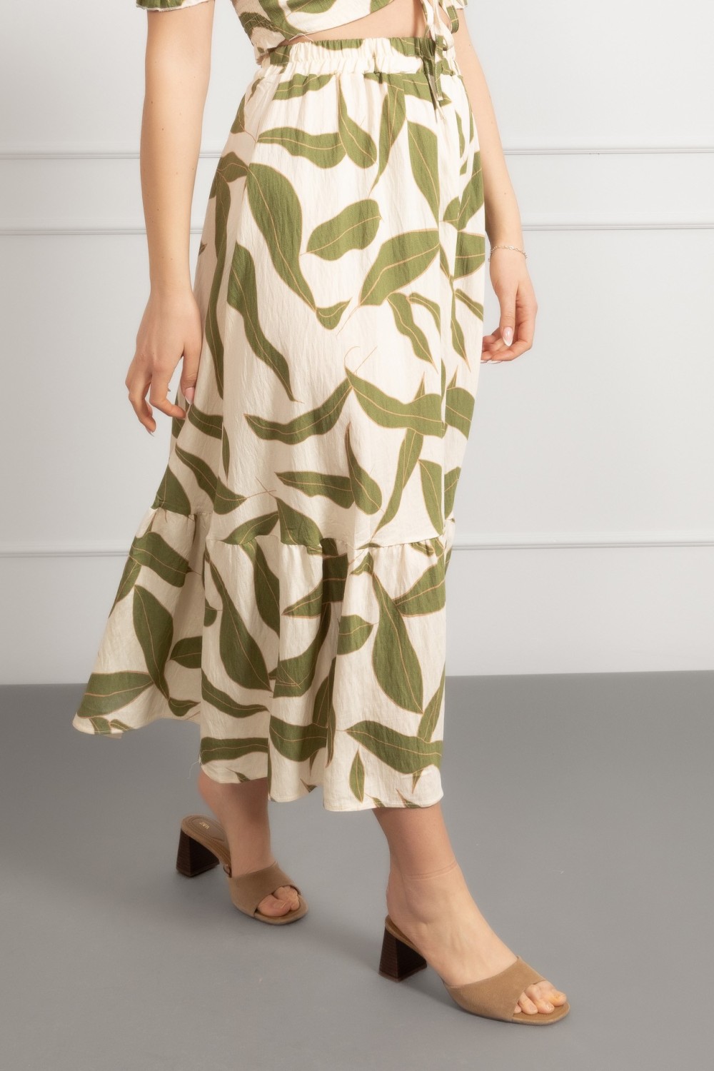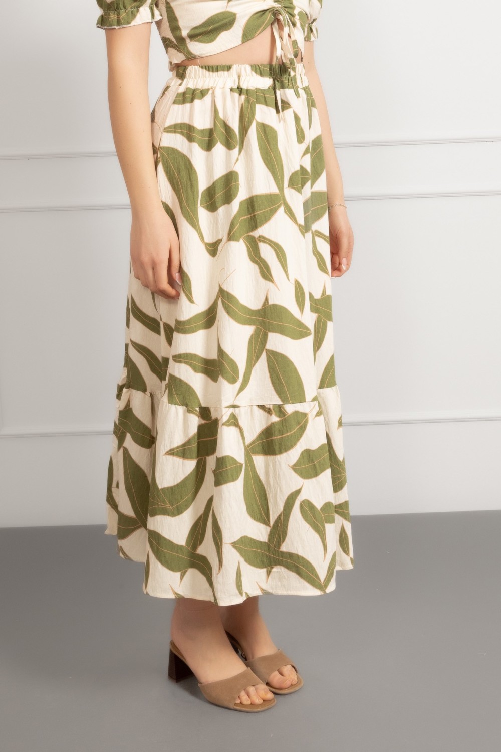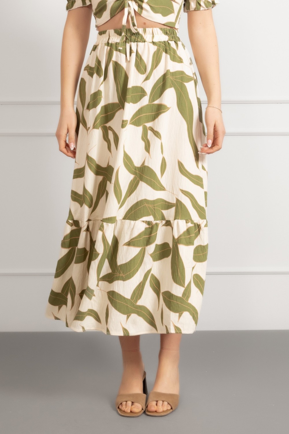 Elegantni dvodijelni komplet u bež nijansi izrađen od lagane mješavine pamuka i lana. Gornji dio bez rukava s ovratnikom, dekorativnim gumbima i vezanjem u struku lijepo naglašava siluetu, d..