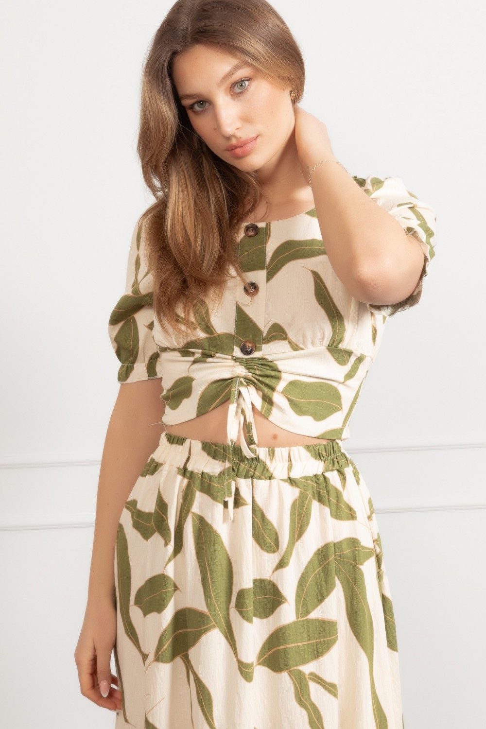 Komplet u nježnoj bež nijansi savršen je izbor za dnevne kombinacije. Gornji dio opuštenog kroja s kratkim rukavima i dekorativnim zlatnim detaljem na rukavu daje poseban i profinjen izgled,..