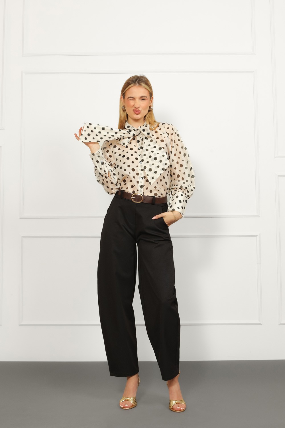 Model je visok 175 cm i nosi veličinu S.