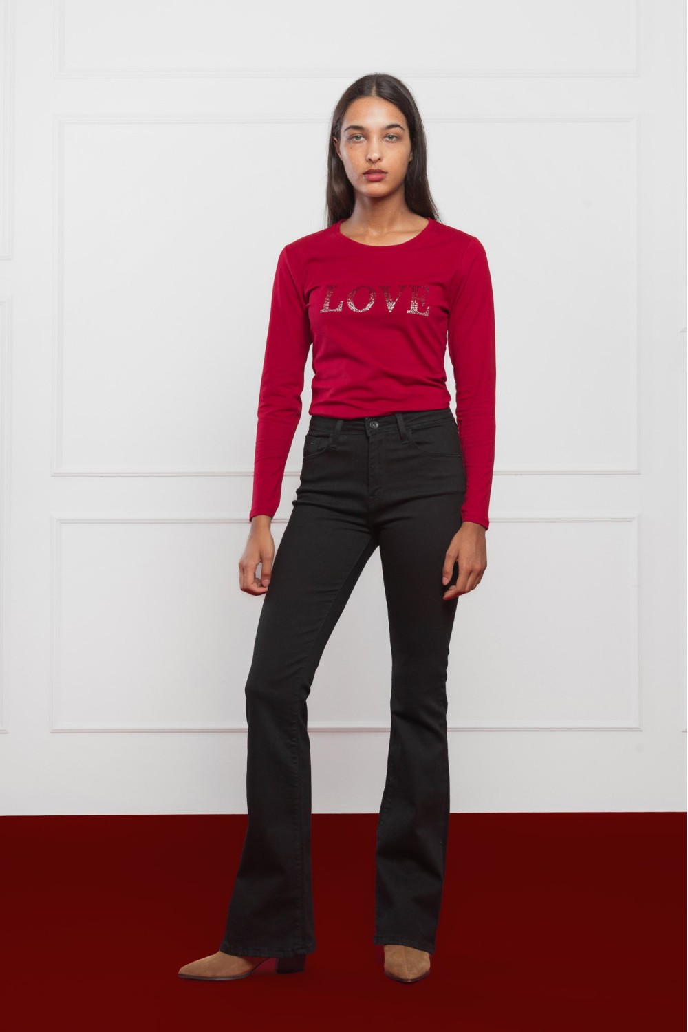 Crna majica dugih rukava s romantičnim detaljem – srce ukrašeno 3D aplikacijom i biserima koje daju poseban, ženstven touch. Natpis unosi dašak pozitivne energije i čini ovaj komad savršenim..