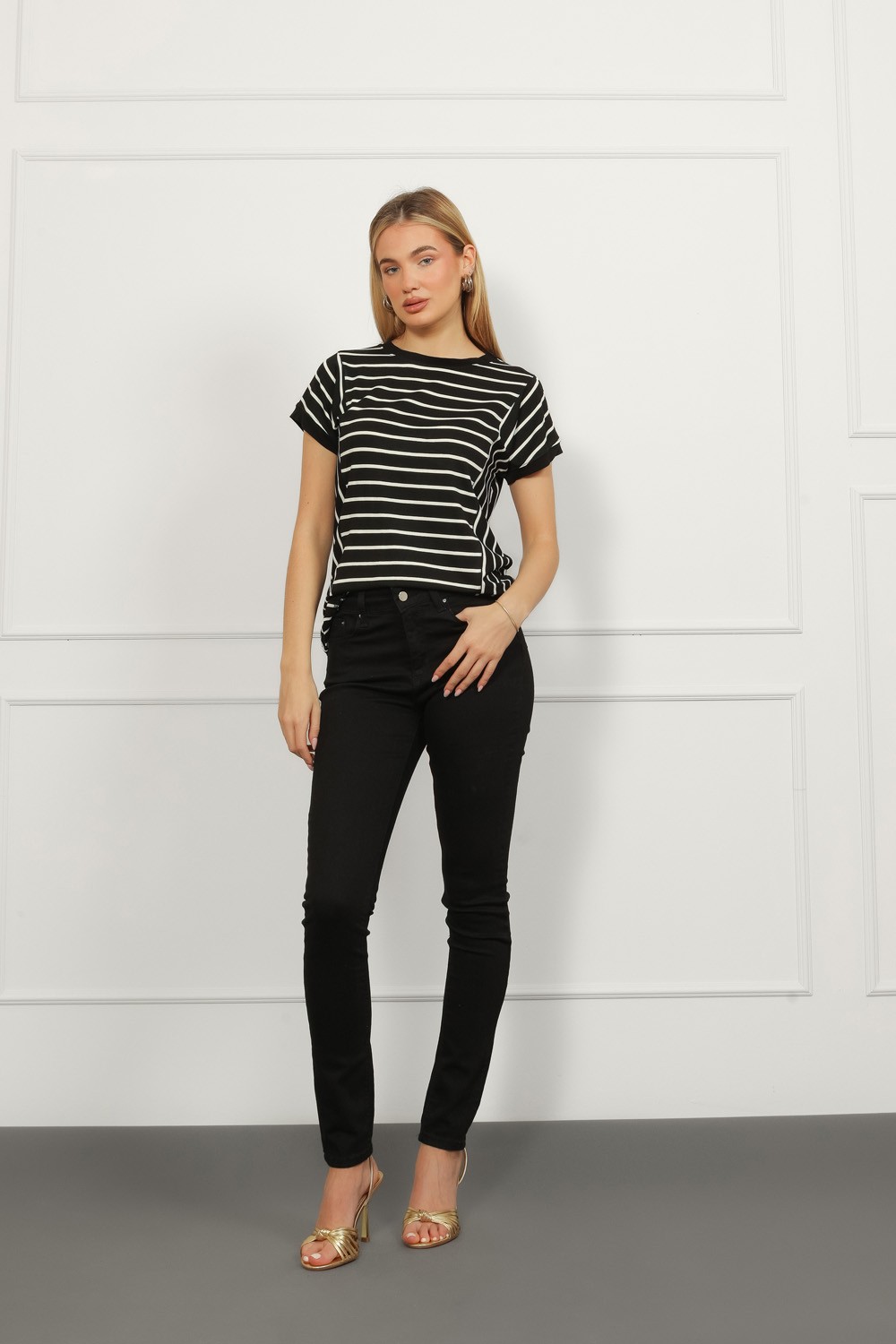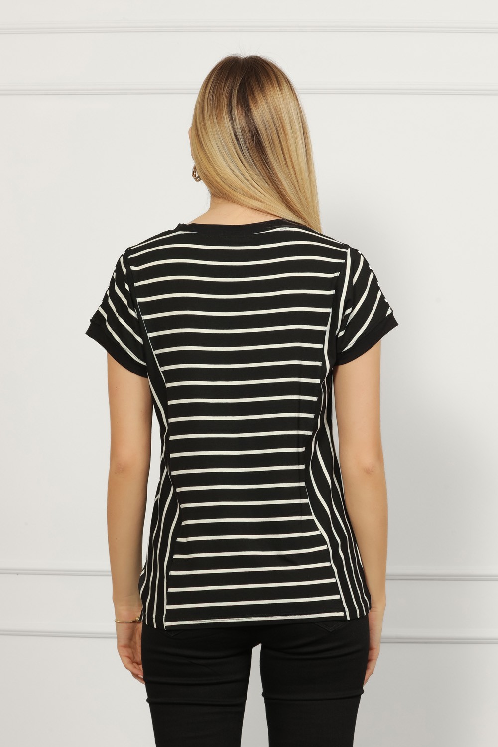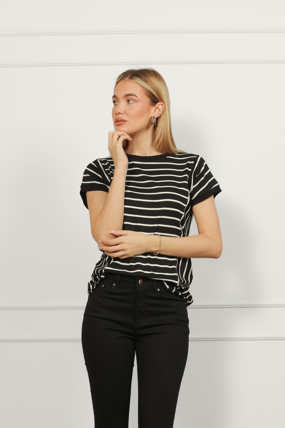 Klasična crna majica s kratkim rukavima podignuta je diskretnim, ali elegantnim detaljima – sitnim ukrasnim kamenčićima koji daju profinjen sjaj svakom outfitu. Mekana viskozna tkanina osigu..