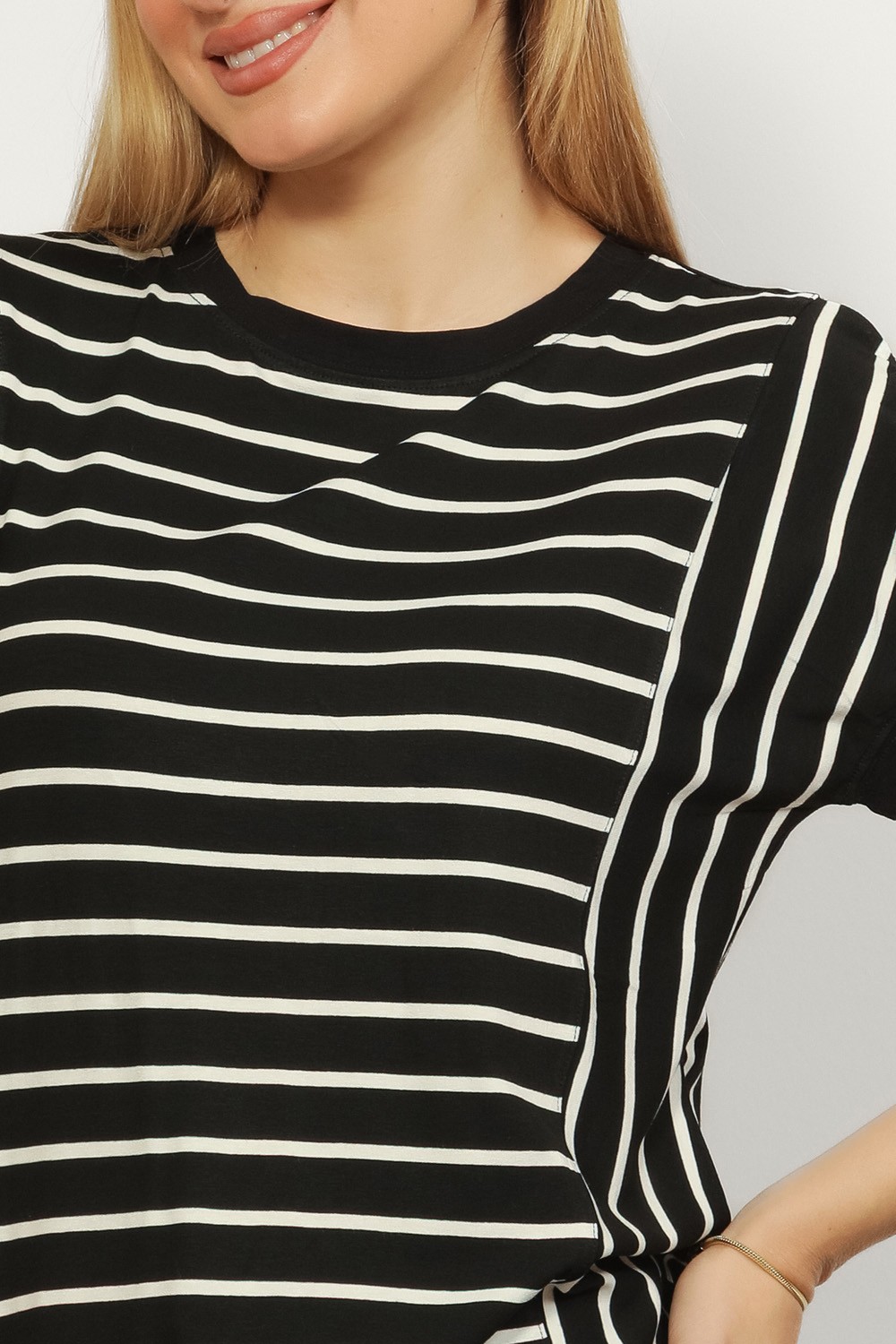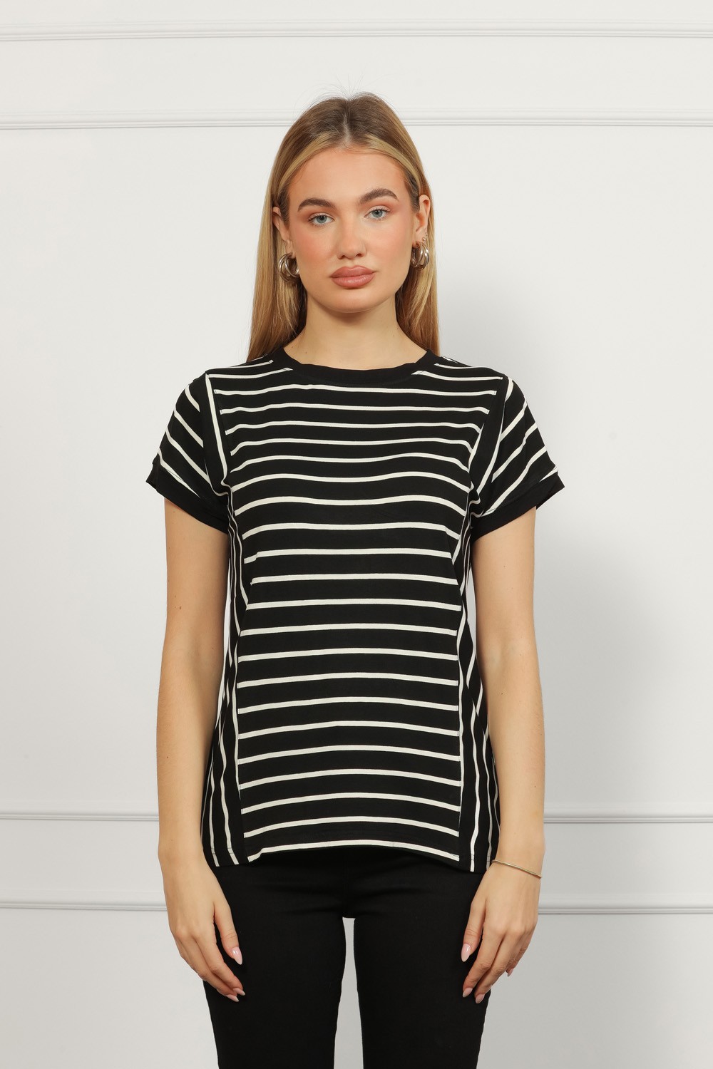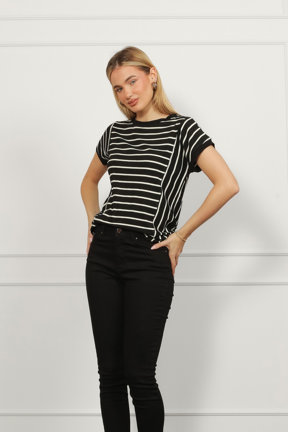 Klasična crna majica s kratkim rukavima podignuta je diskretnim, ali elegantnim detaljima – sitnim ukrasnim kamenčićima koji daju profinjen sjaj svakom outfitu. Mekana viskozna tkanina osigu..
