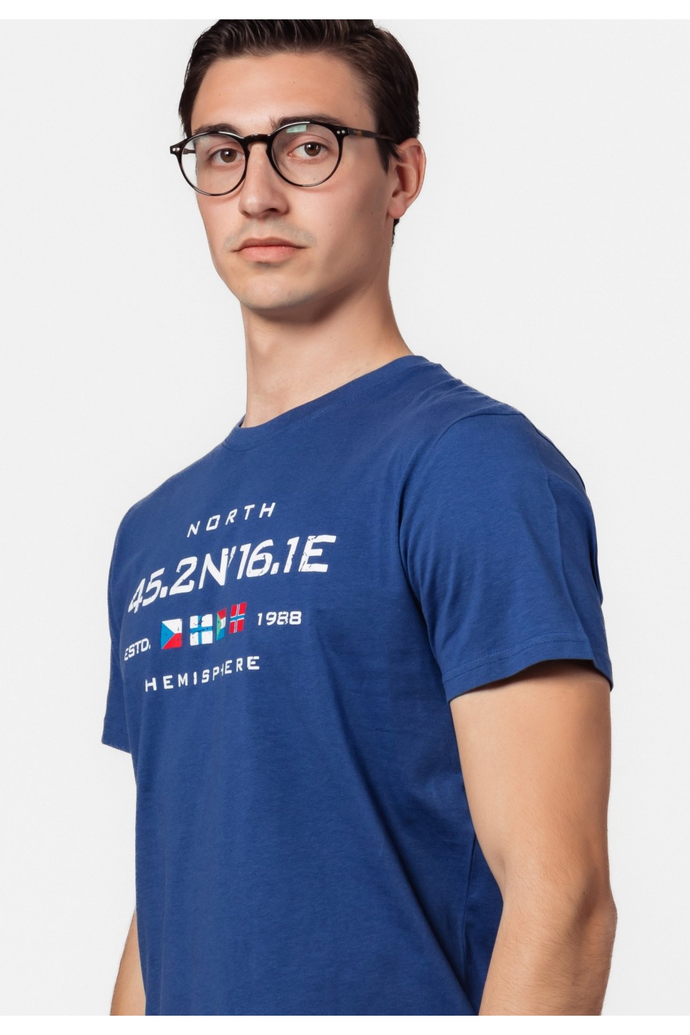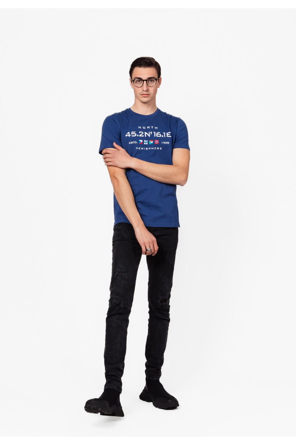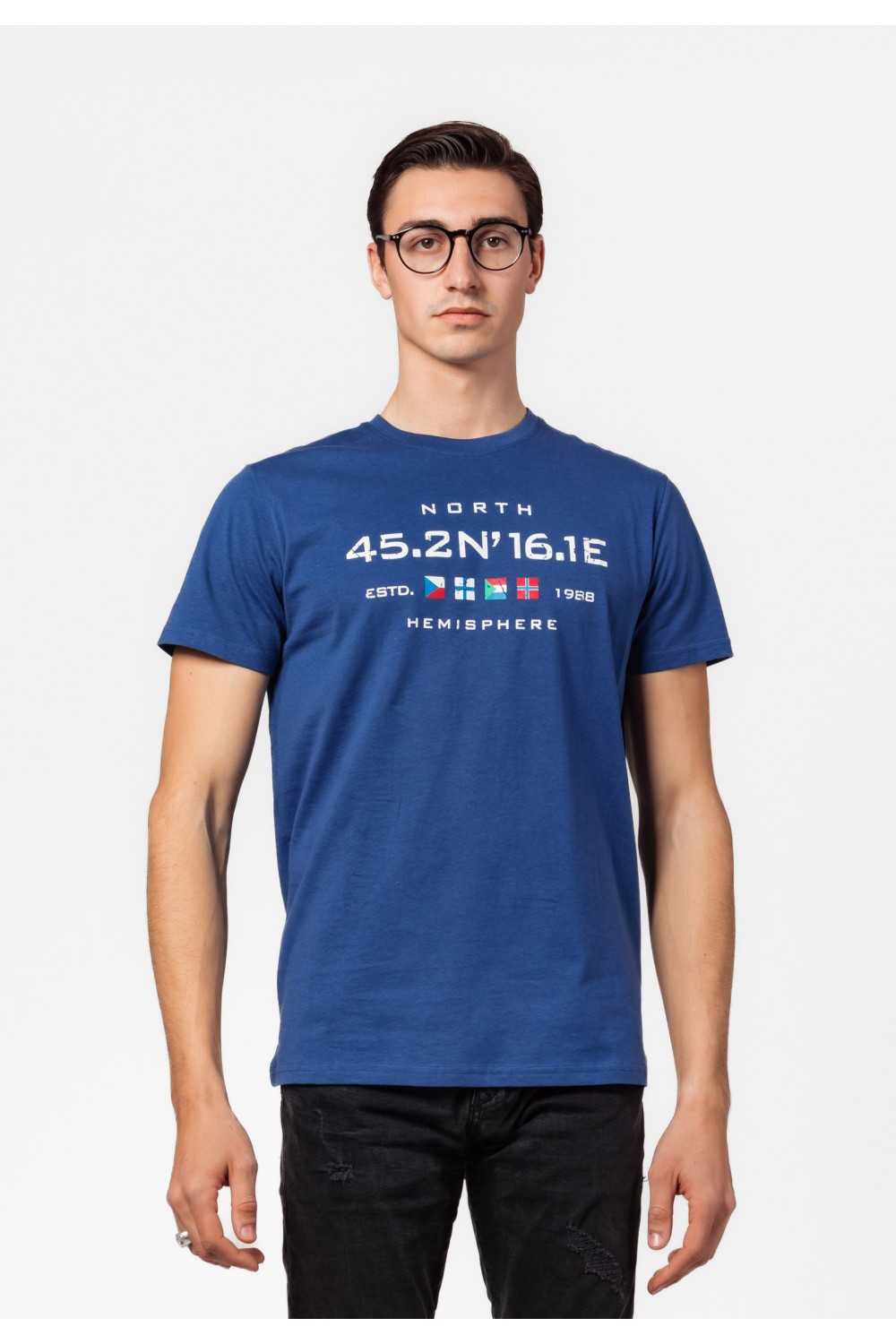 Regular fit muška tamno plava majica, kratkog rukava. Okrugli ovratnik s renderom. Sprijda gumirani sivi AMDS Jeanas tisak, te na lijevom rukavu manji tisak. - 100% PAMUKModel je visok 194 c..