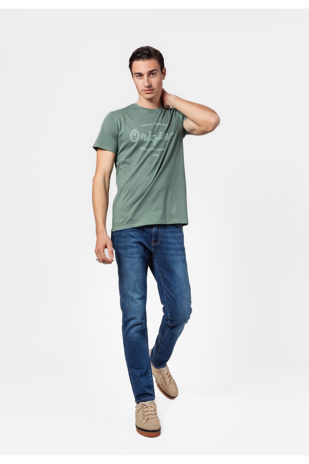 Regular fit muška tamno plava majica, kratkog rukava. Okrugli ovratnik s renderom. Sprijda gumirani sivi AMDS Jeanas tisak, te na lijevom rukavu manji tisak. - 100% PAMUKModel je visok 194 c..