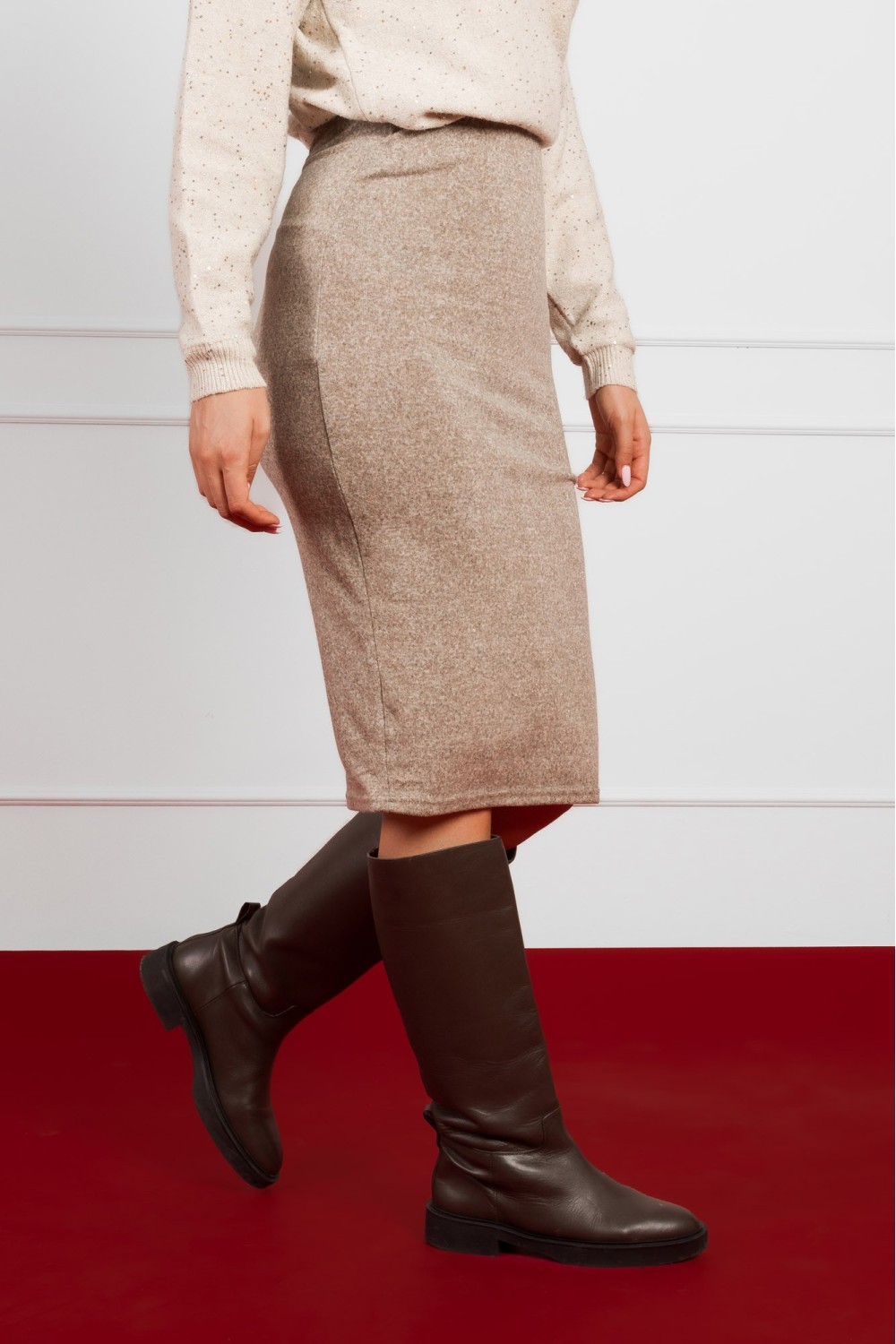 Pletena bež plisirana suknja A kroja. Lako se kombinira s košuljom i visokim čizmama za poslovni look ili s dolčevitom i ravnim čizmama za ležernu, chic kombinaciju. Idealna je za jesen i zi..