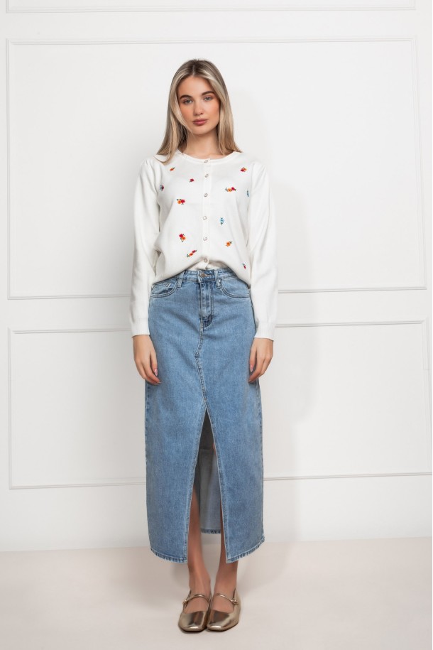 Midi traper suknja ravnog kroja s gumbima po cijeloj dužini donosi vintage chic izgled koji se lako kombinira. Izrađena od čvrstog trapera svijetloplave boje, s praktičnim prednjim džepovima..
