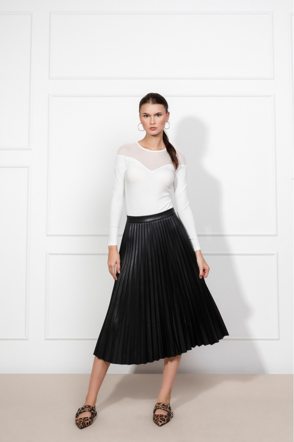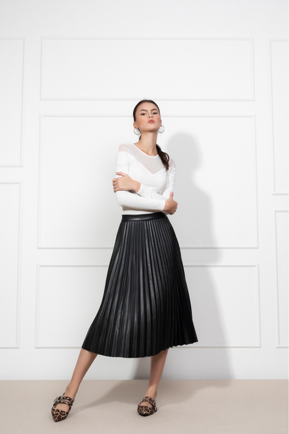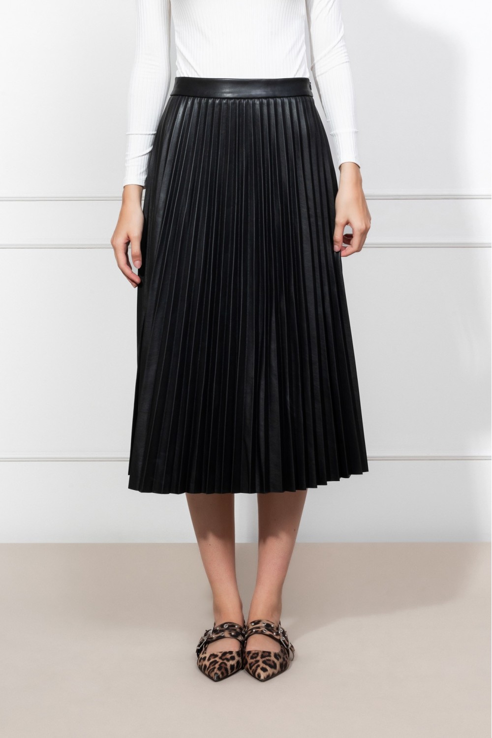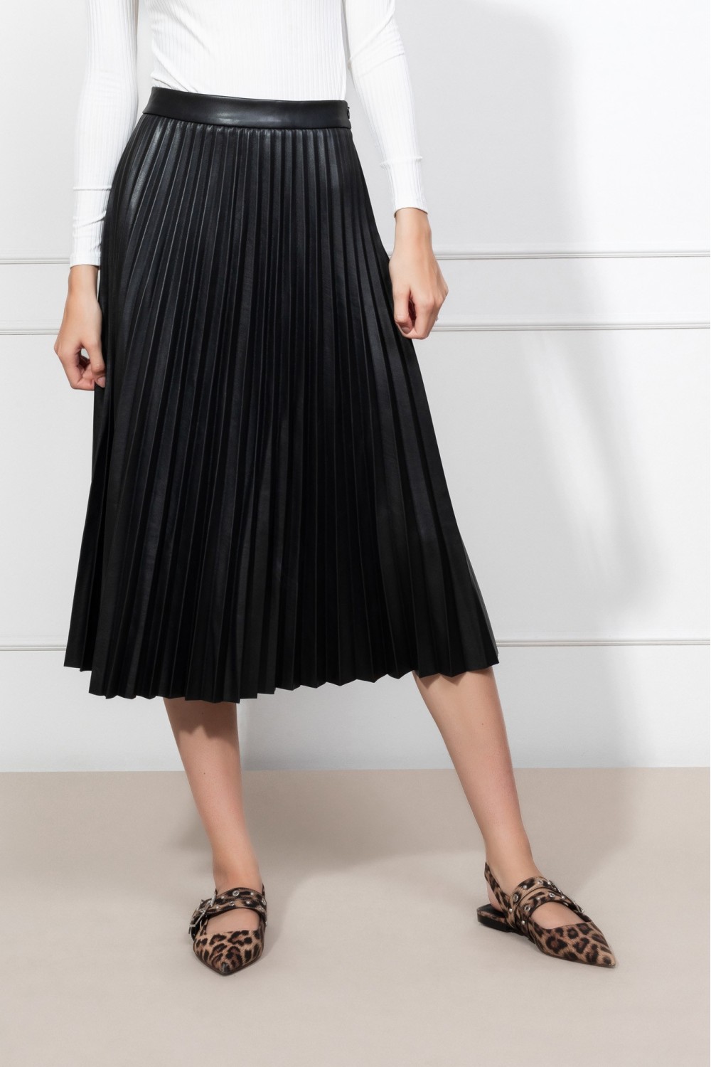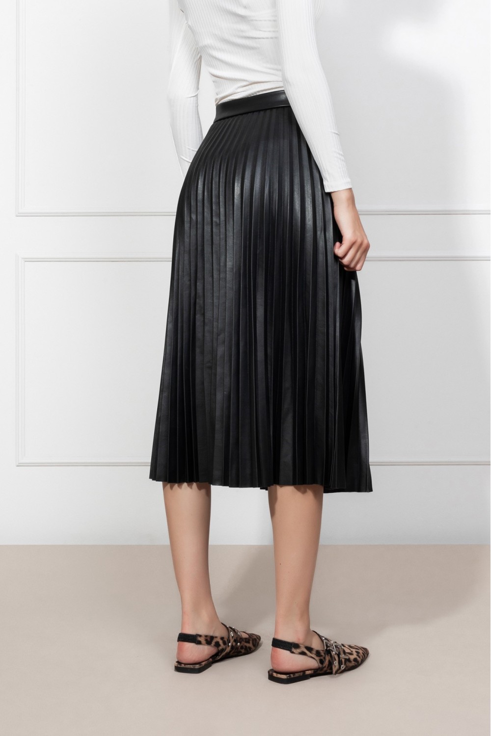 Plisirana kožna crna suknja, midi dužina. Kopčanje bočnim sakrivenim patent zatvaračem.