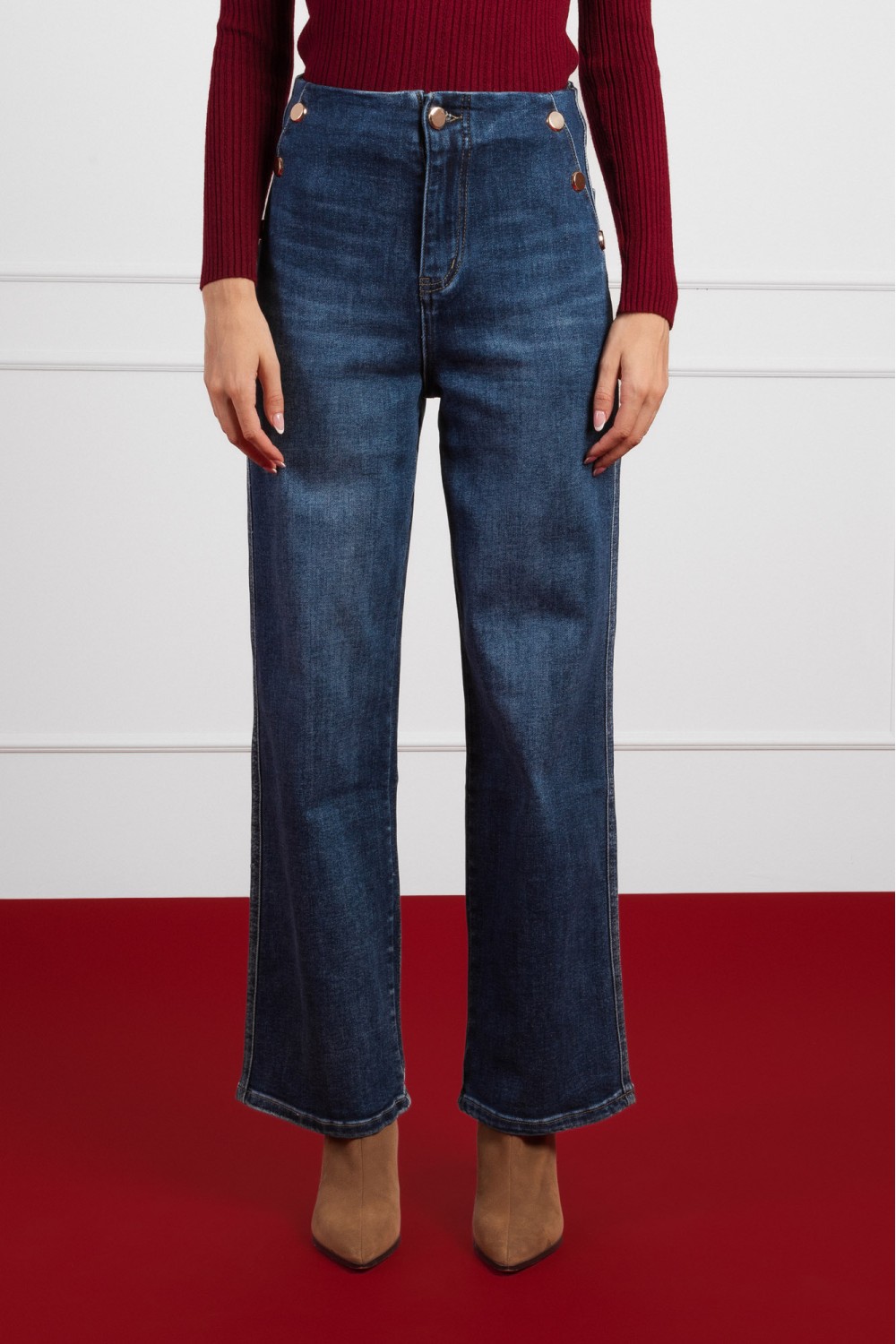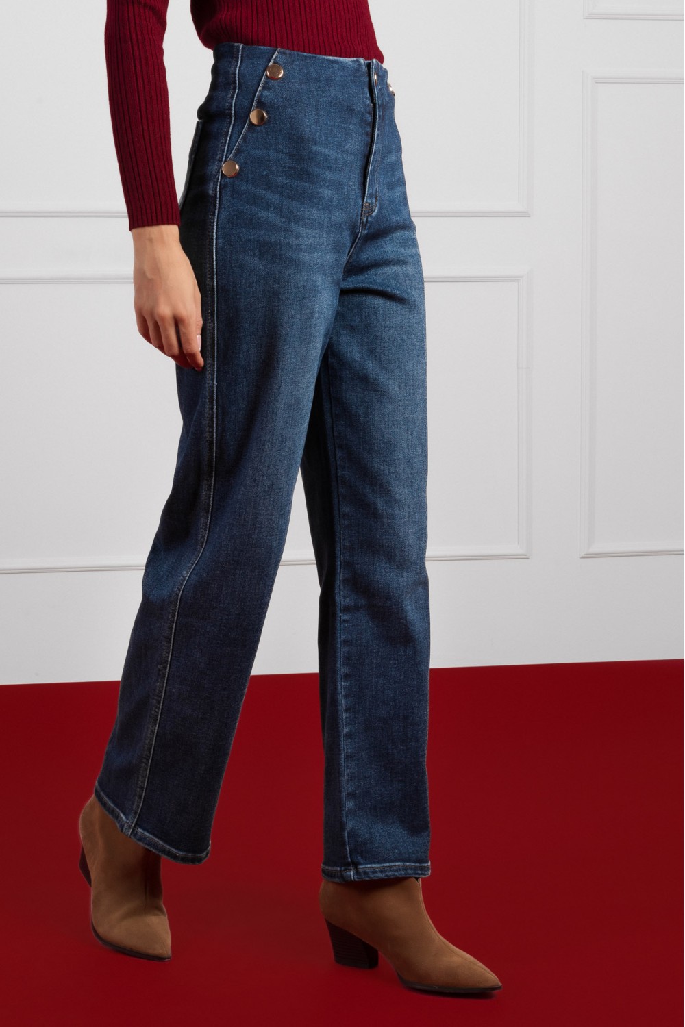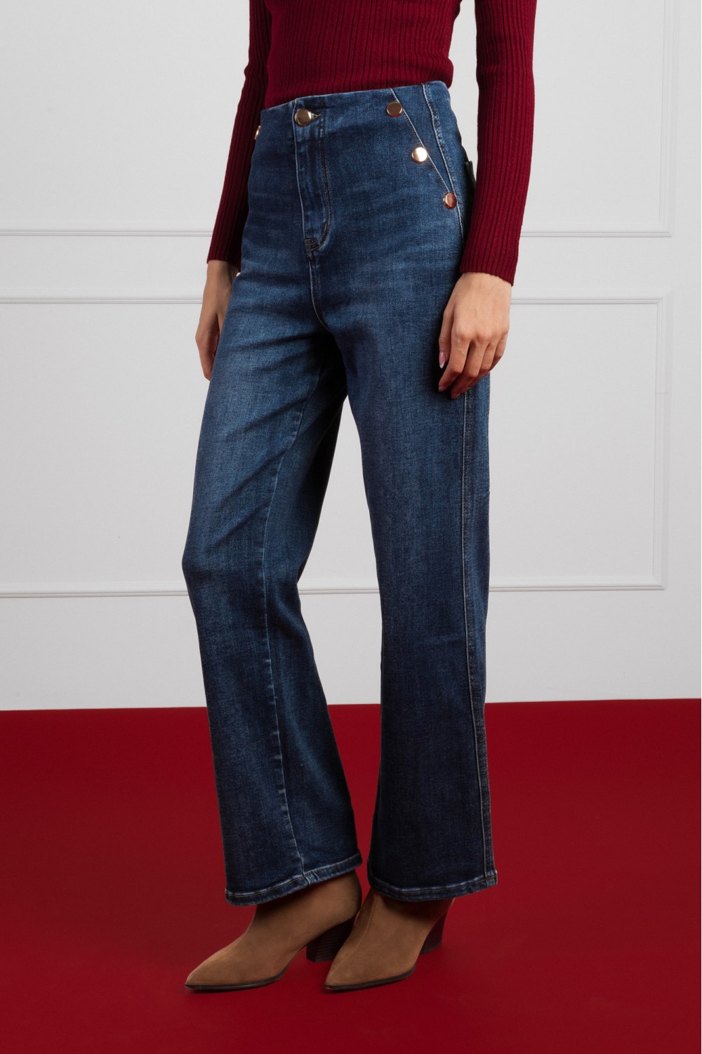 Plave traper hlače visokog struka s dekorativnim gumbima s obje strane – moderan i chic izbor za svaki dan. Elegantni detalji čine ih posebnom verzijom klasičnih traperica, dok rastezljivi m..