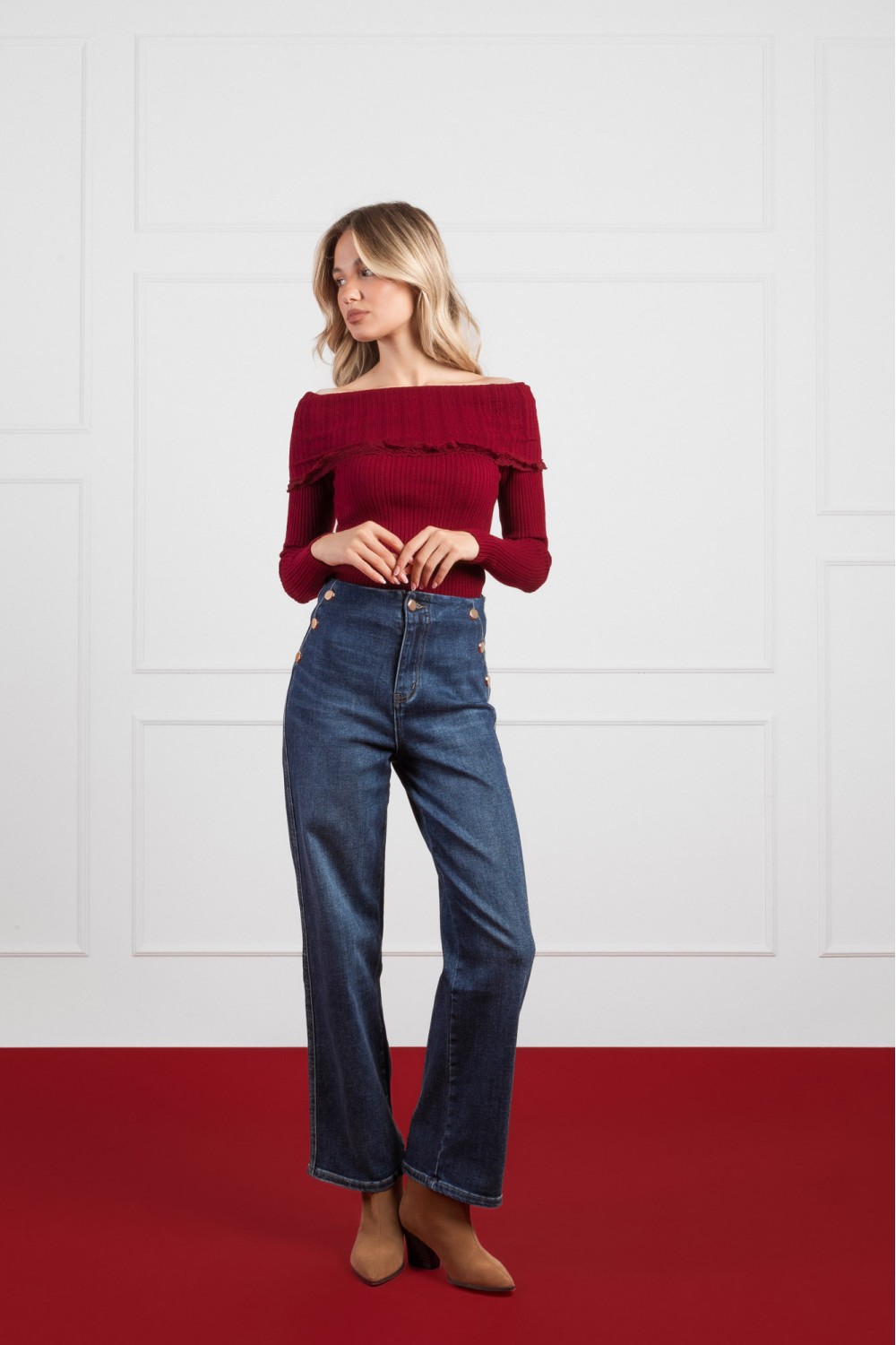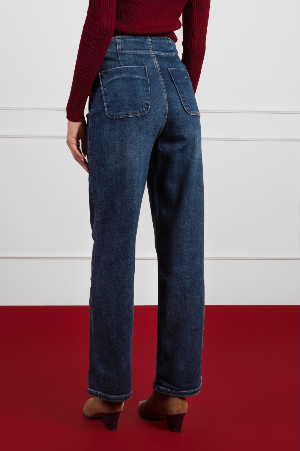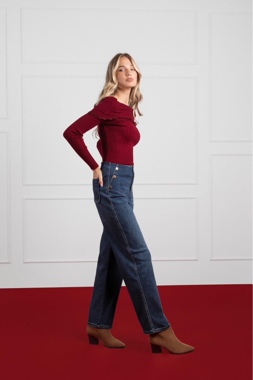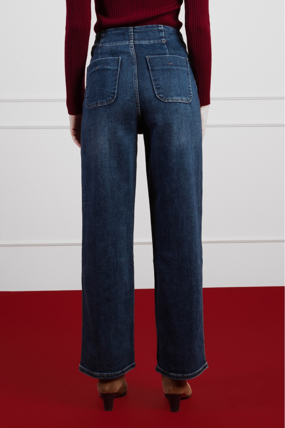 Plave traper hlače visokog struka s dekorativnim gumbima s obje strane – moderan i chic izbor za svaki dan. Elegantni detalji čine ih posebnom verzijom klasičnih traperica, dok rastezljivi m..