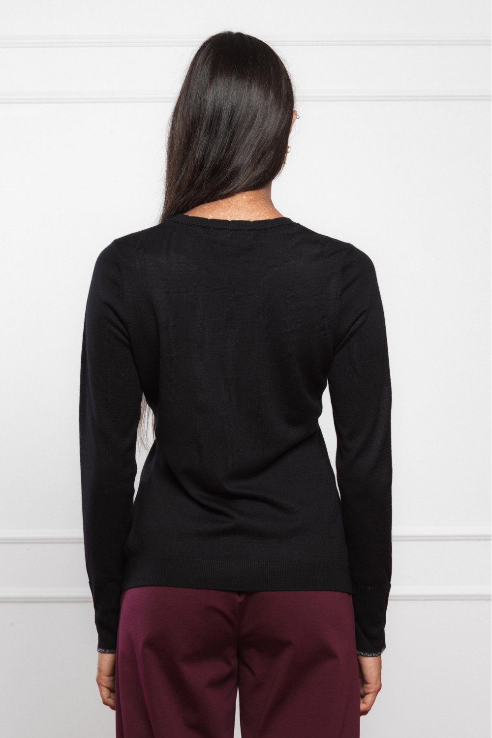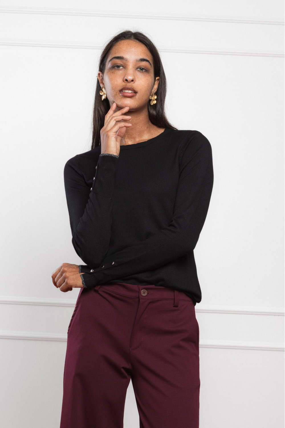 Traperice s visokim strukom i ukrasnim zlatnim gumbima. Tamnoplavi traper vizualno izdužuje figuru, dok elastični dodatak osigurava udobnost pri nošenju. Idealne su za kombiniranje s košuljo..