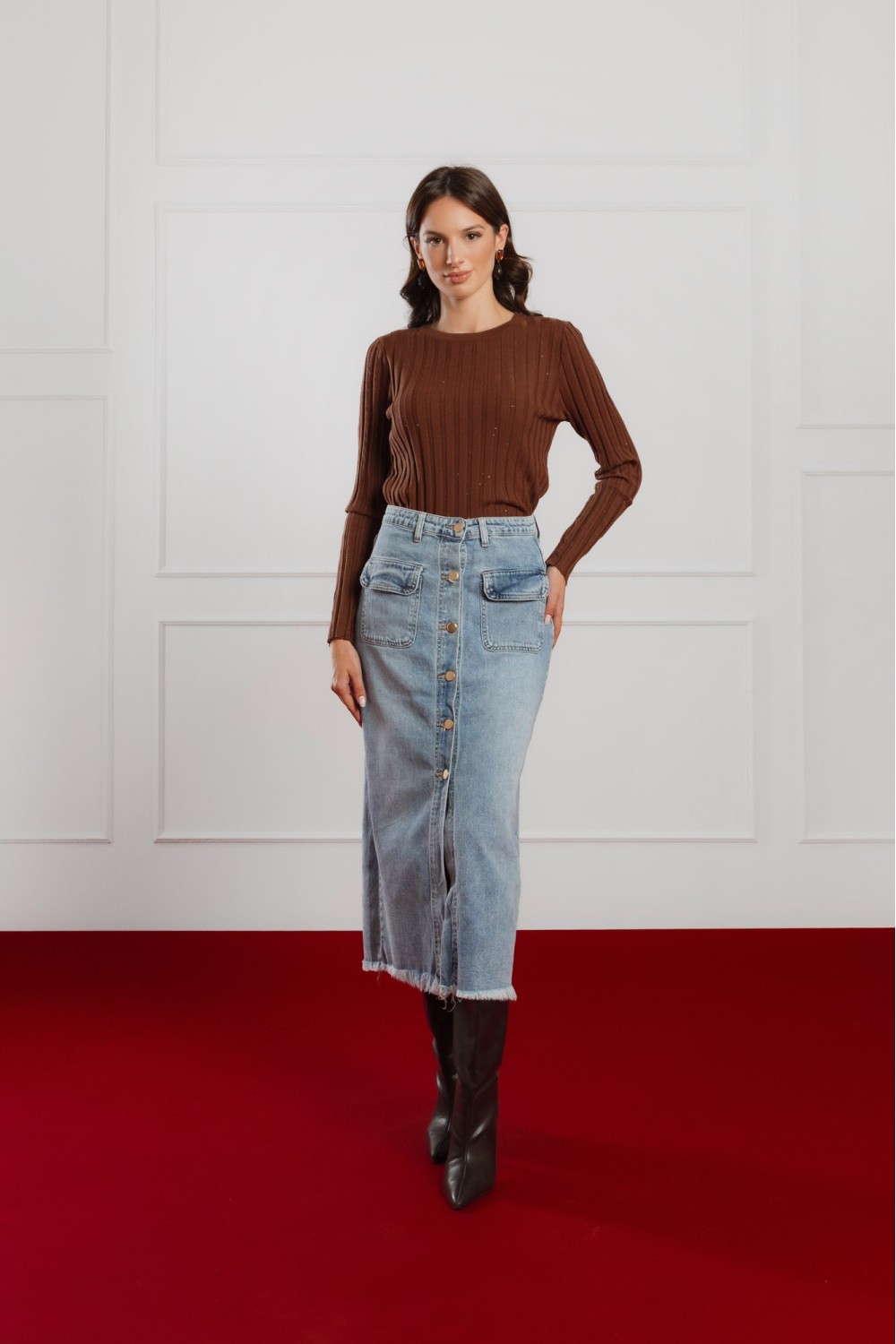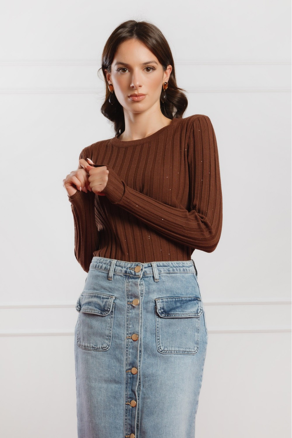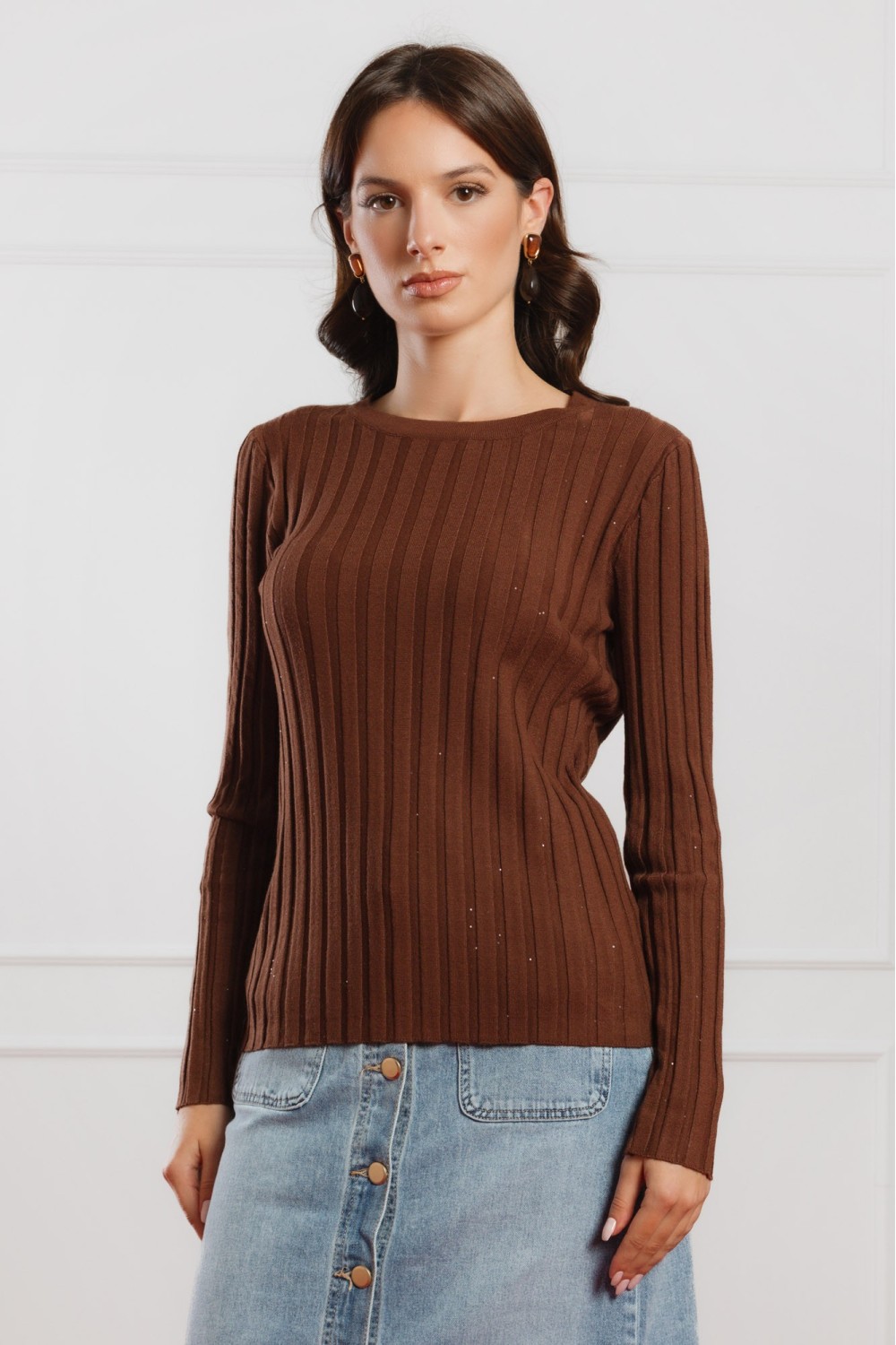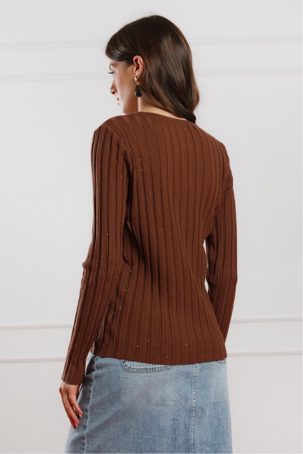 Elegantna smeđa majica dugih rukava savršen je izbor za sve prigode u kojima želiš spojiti udobnost i elegantan izgled. Poseban detalj ruža daje ženstveni dojam, dok lagano elastičan materij..