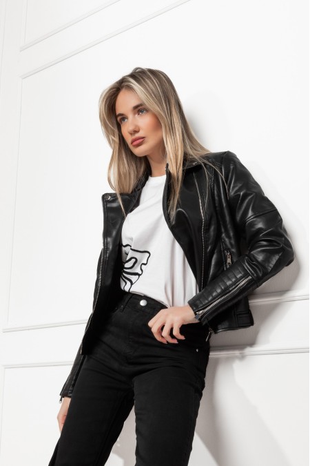 Ženska crna kožna jakna s krznom – bezvremenski klasik u modernom izdanju. Luksuzni detalj krznenog ovratnika daje toplinu i dozu glamura, dok asimetričan zatvarač i metalni zipovi naglašava..