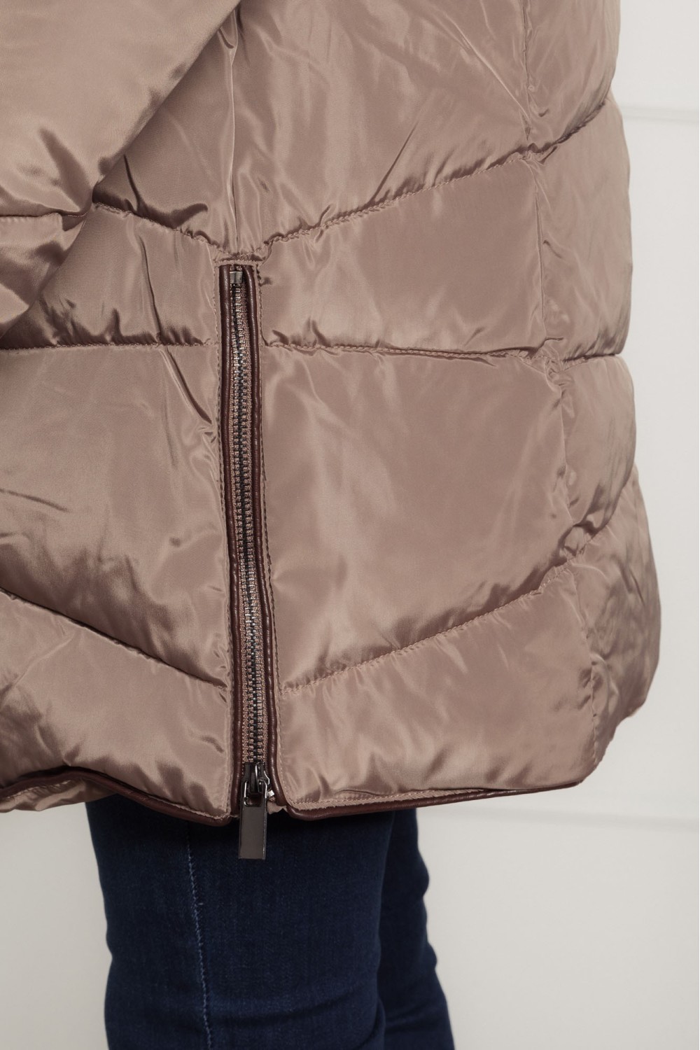 Tamno smeđi kožni detalji na rubovima. Kopčanje sprijeda patent zatvaračem i remenom s kopčom u struku. Džepovi s patentnim zatvaračima.Povišeni ovratnik s detaljem remena.