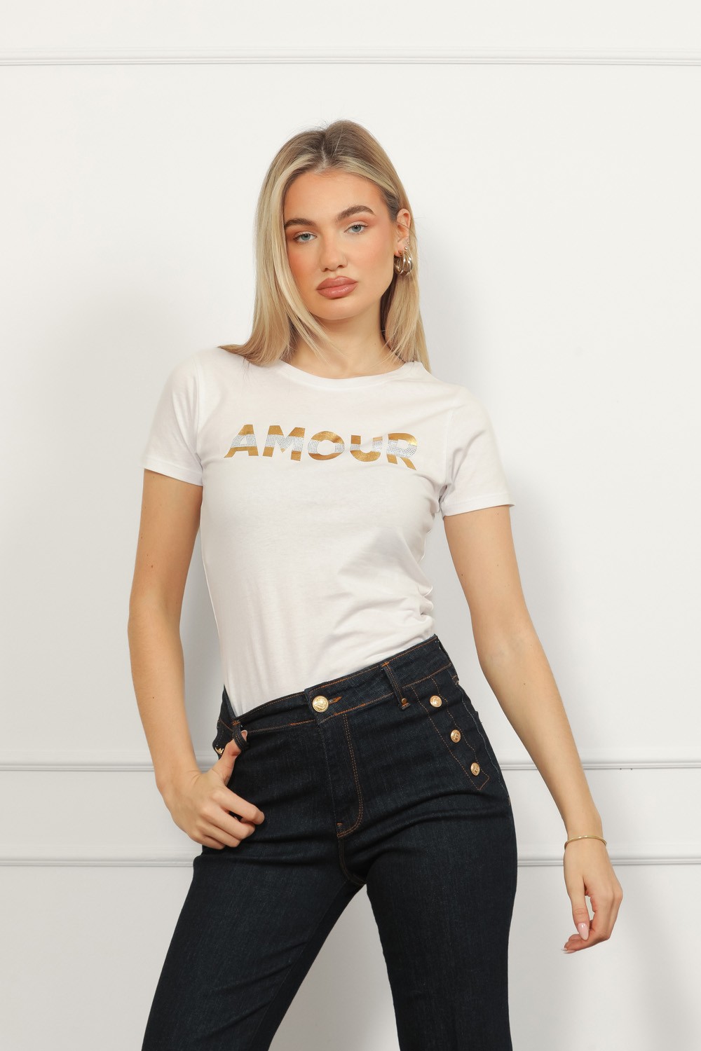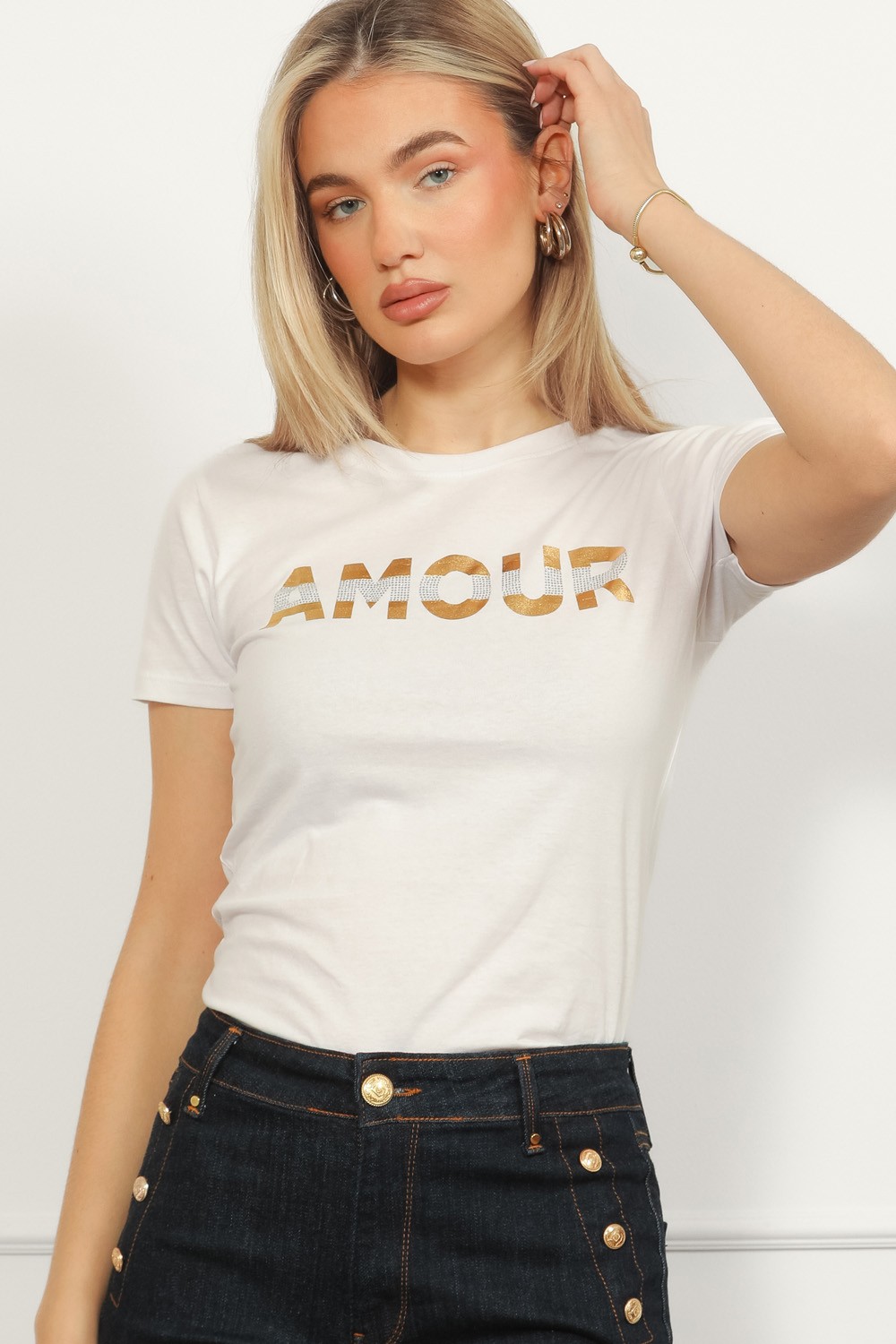 Majica s printom Paris u tipografiji i detaljima u obliku sjajnih dugmadi koji joj daju chic dojam bez previše truda. Posebnost ovog modela su kratki čipkasti rukavi koji majicu čine posebni..