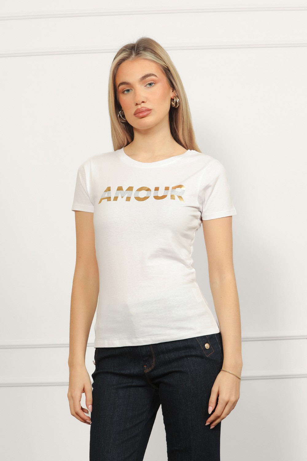 Majica kratkih rukava u prljavo bijeloj boji s dekorativnim perlicama koje formiraju natpis style i daju joj elegantan, ženstven izgled. Mekan i elastičan materijal osigurava udobnost tijeko..