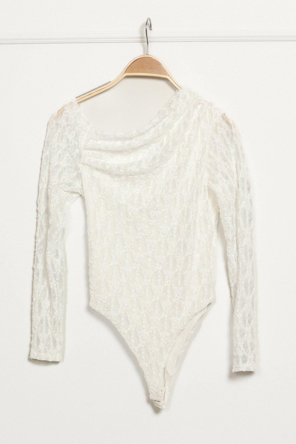 Ovaj bijeli body dugih rukava izrađen je od reljefnog materijala koji daje dubinu i vizualno podiže cijeli outfit. Elegantno prati liniju tijela, a zahvaljujući elastičnosti pruža udobnost tijekom cijelog dana.