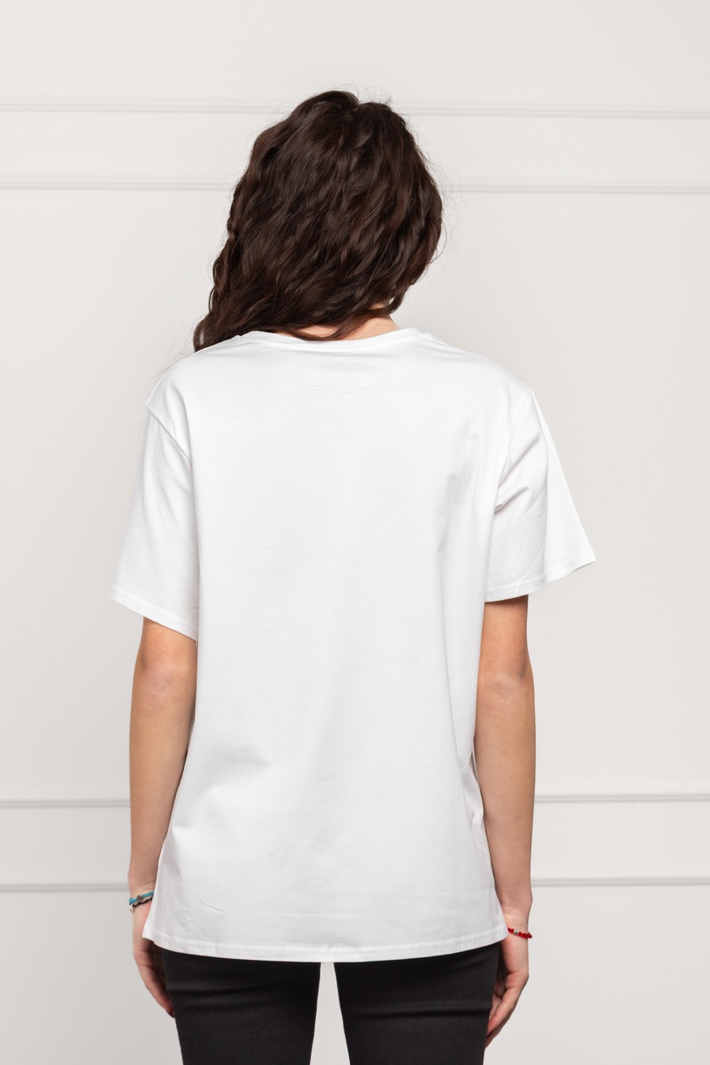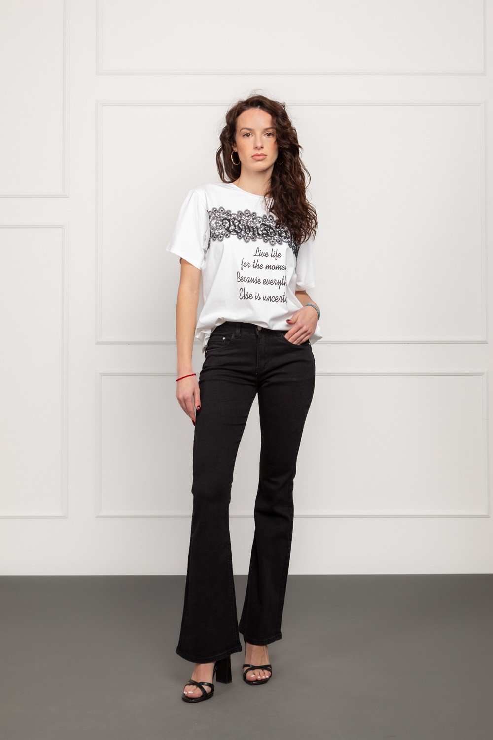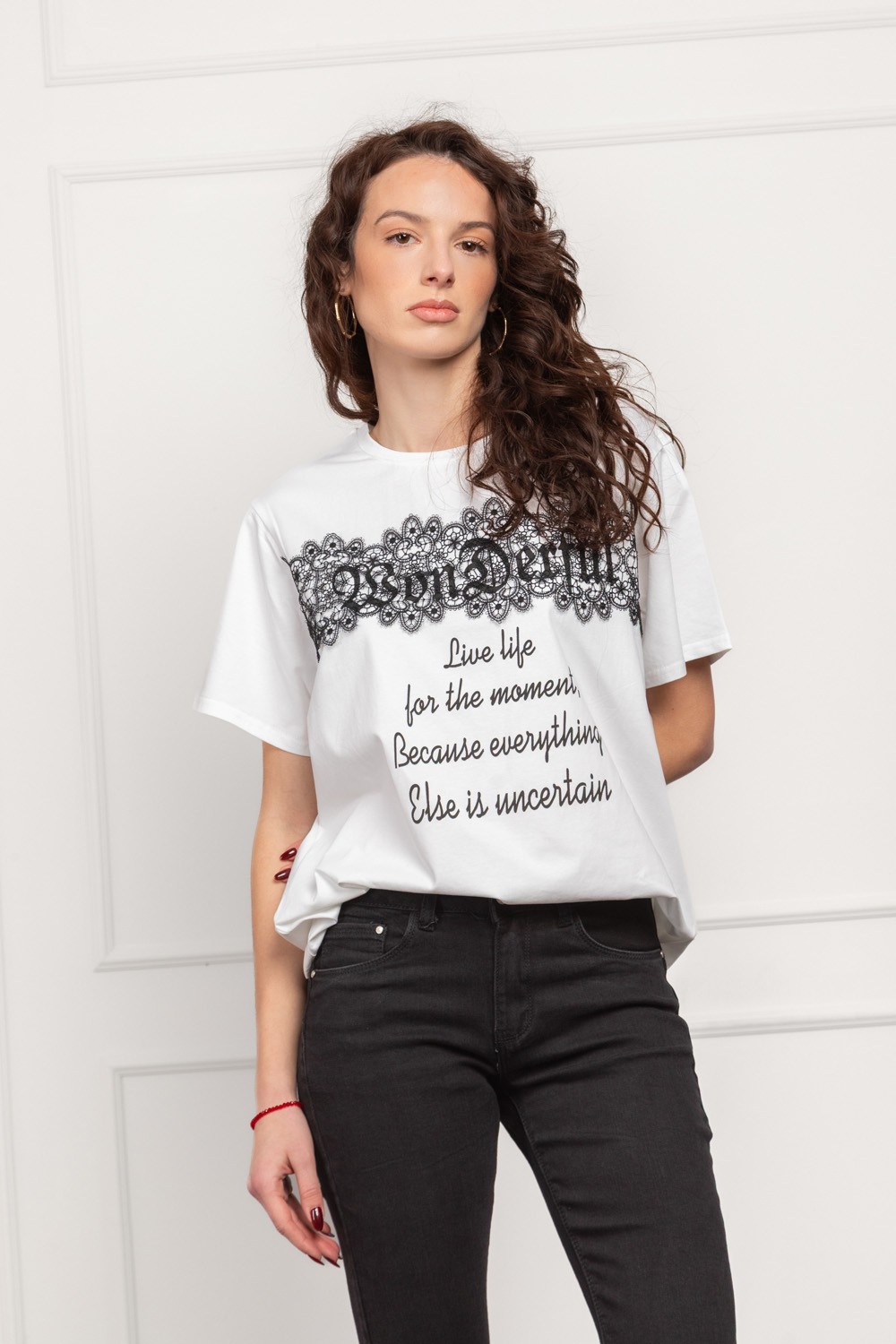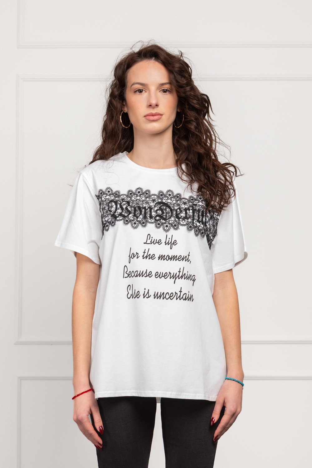 Ženska majica kratkih rukava u bijeloj boji, ukrašena širokom linijom dekorativne crne čipke koja se proteže preko prednjeg dijela i daje snažan, elegantan kontrast. Ispod čipke nalazi se inspirativan natpis koji dodatno naglašava modni karakter majice i čini je posebnim komadom za svakodnevne, ali i dotjeranije outfite. Pamučna baza je mekana i ugodna za nošenje, dok čipka donosi trendi, ženstveni dojam.