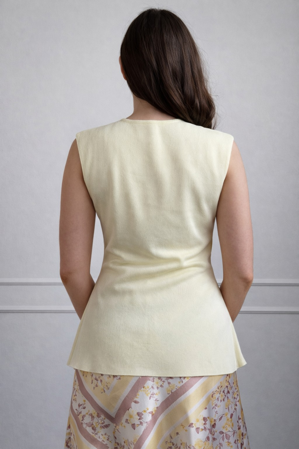 Žuta majica jednostavnog, ali efektnog kroja koji lijepo prati liniju tijela i naglašava struk. Minimalistički dizajn s čistim linijama čini ga savršenim komadom za slojevito kombiniranje – nosiv uz suknje, hlače ili kao dio kompleta za ured.