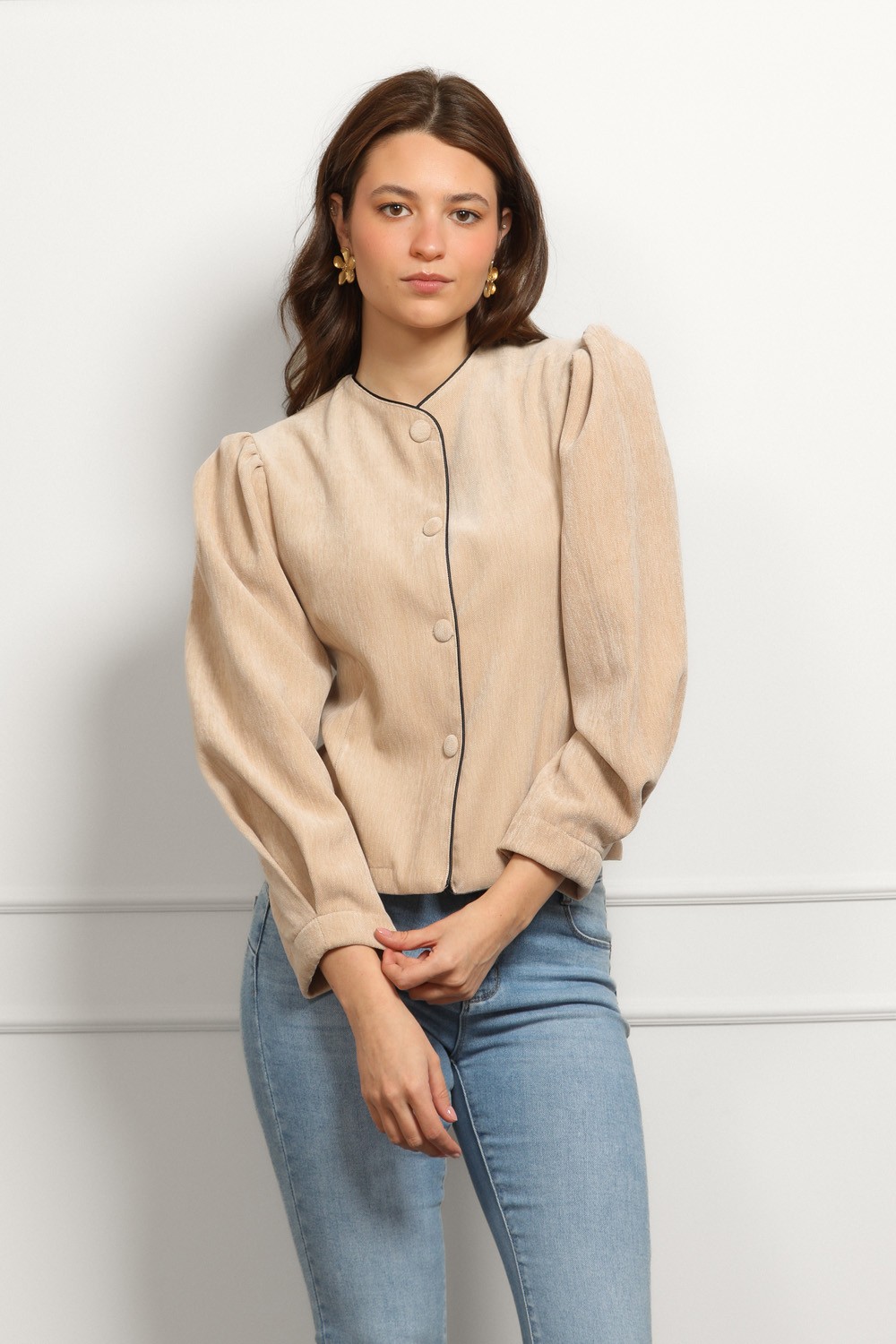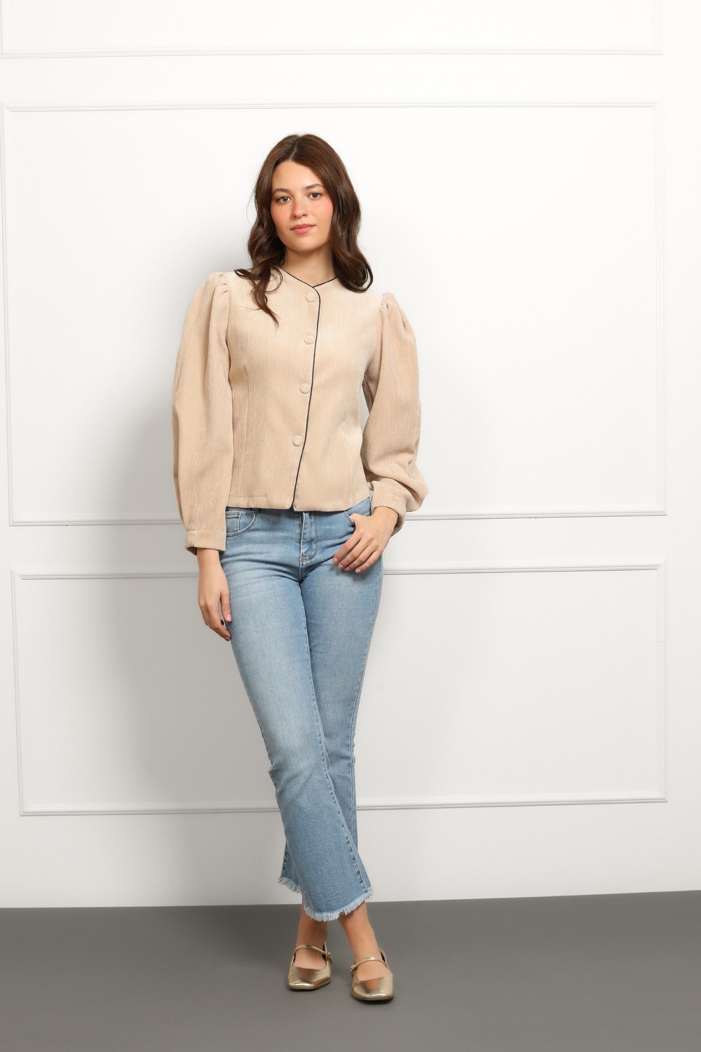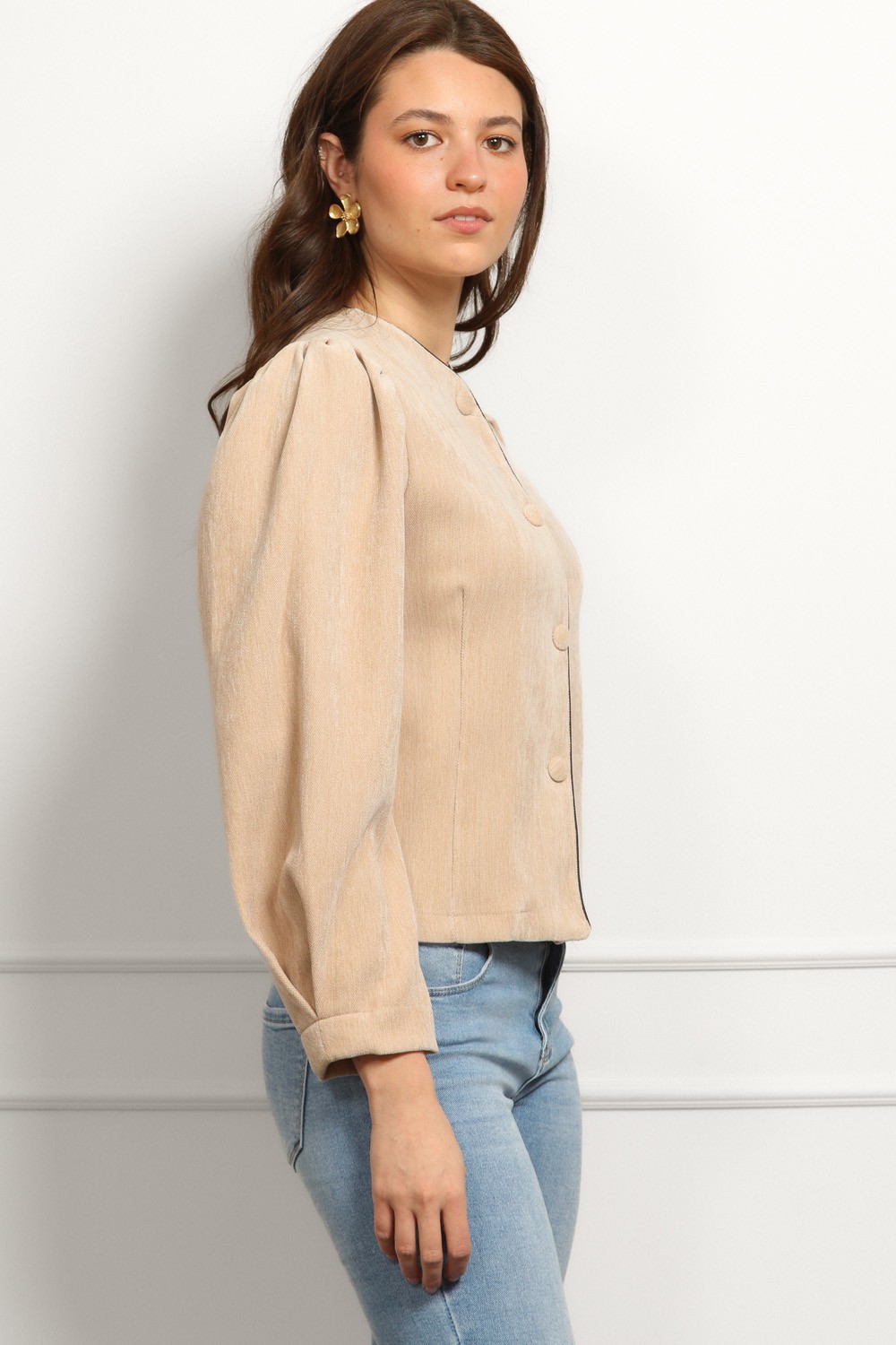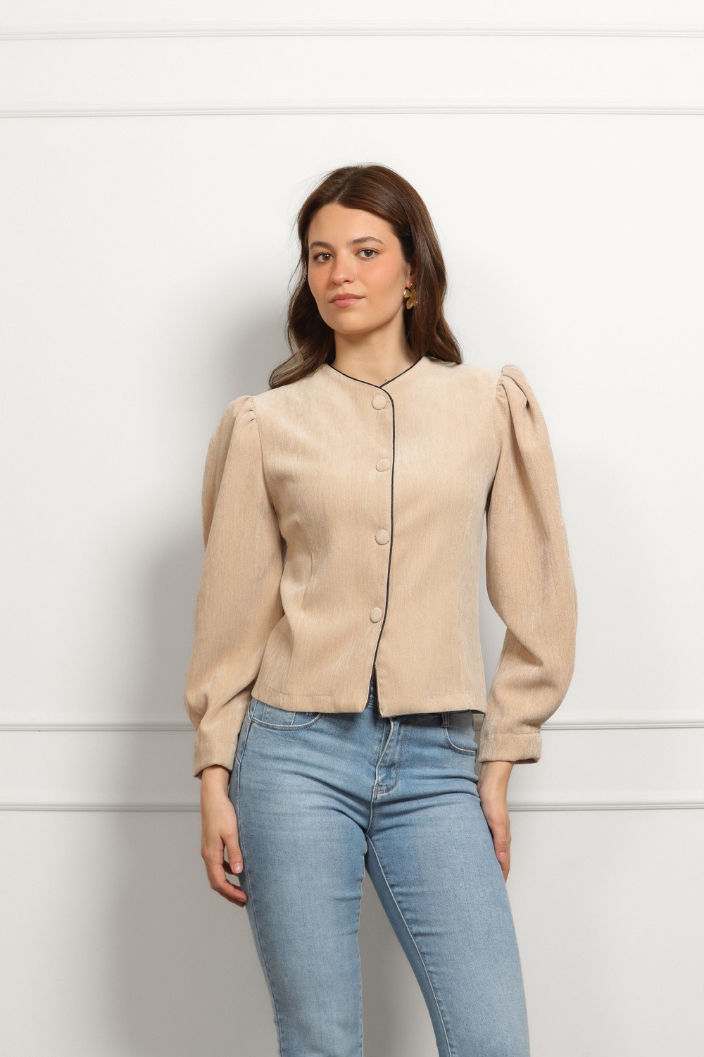Elegantni bež kardigan profinjenog kroja koja spaja minimalizam i sofisticirane detalje. Okrugli izrez bez ovratnika, presvučeni gumbi i kontrastni crni rub daju joj moderan, pomalo pariški štih.